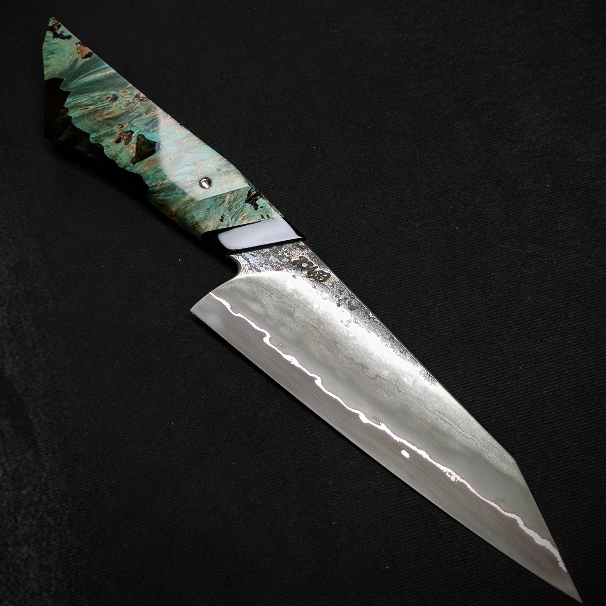 - Stabilised burl chestnut handle with translucent resin.