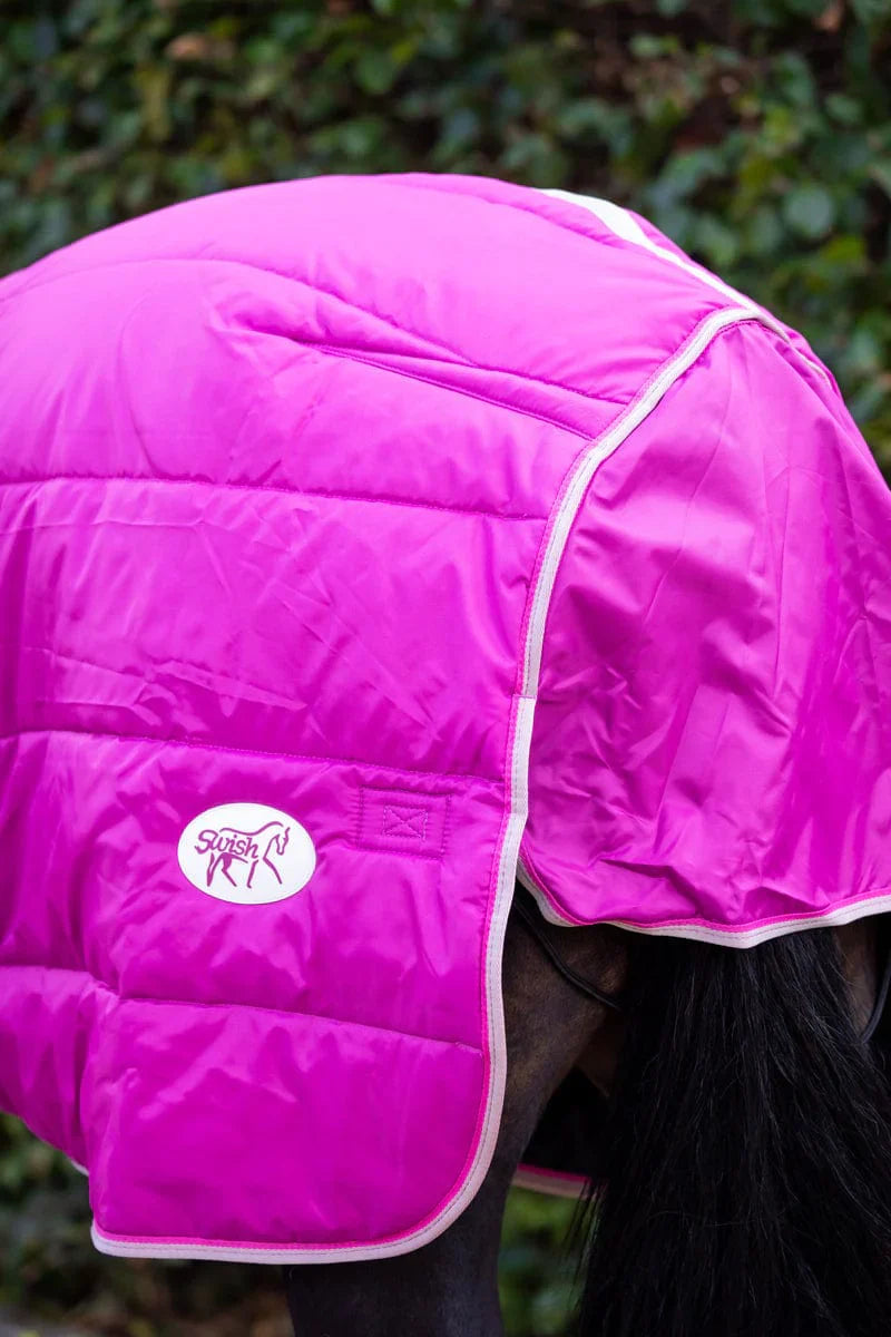 A fantastic Medium Weight Detachable Neck Stable Rug that can be used with or without the detachable neck cover. It has a 200g filling. It has large shoulder gussets, cross surcingles and a tail flap. Soft nylon lining with anti slip darts on the quarters. It is designed to sit higher on the neck/shoulders to prevent the rug from slipping back and rubbing, we have had fantastic feedback about this design. The neck attaches with 2 pieces of double sided velcro. This rug also comes with a handy storage bag.