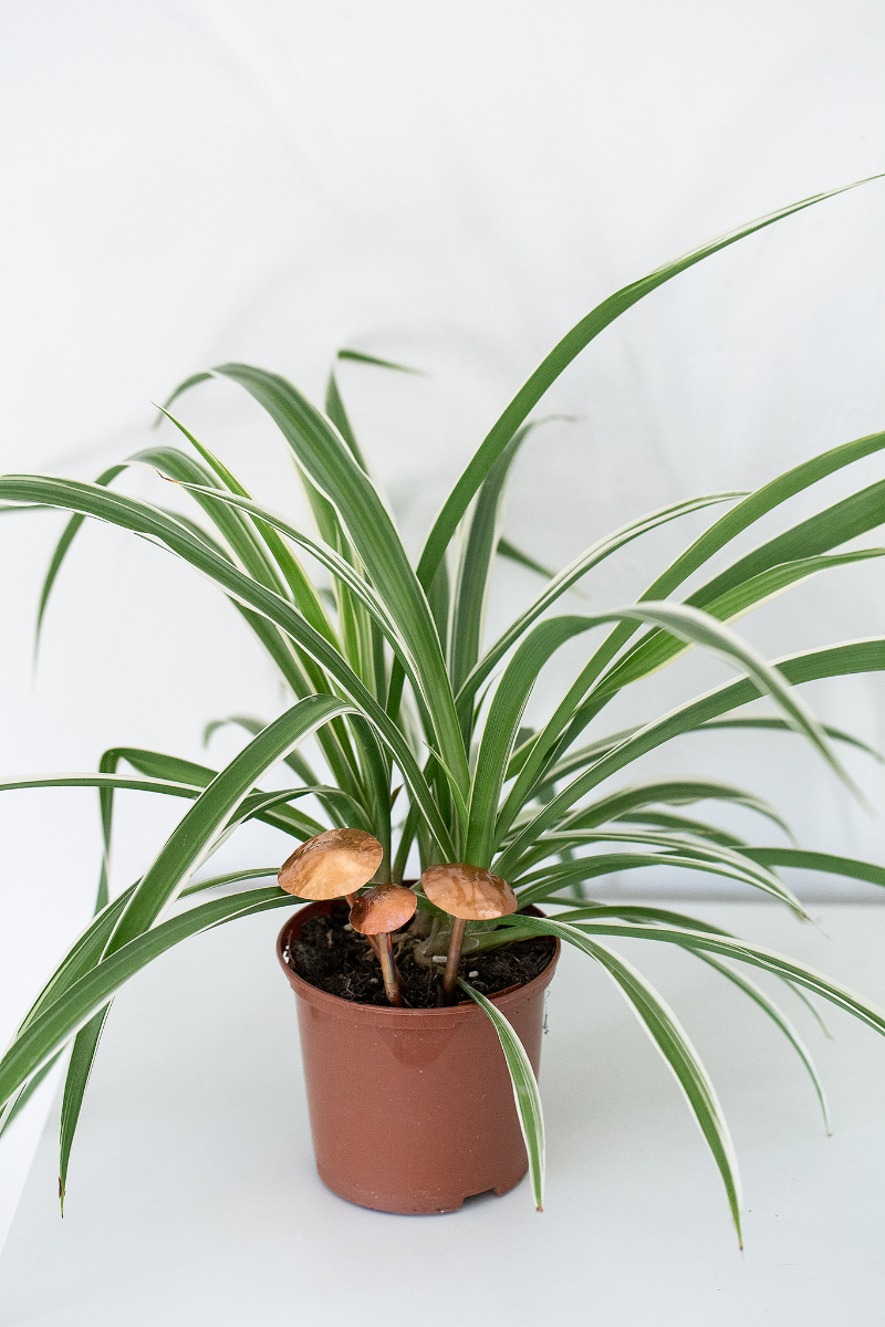 These elegant copper mushrooms are sold in groups of 3. They can live indoors in your plant pots or outside in the garden.