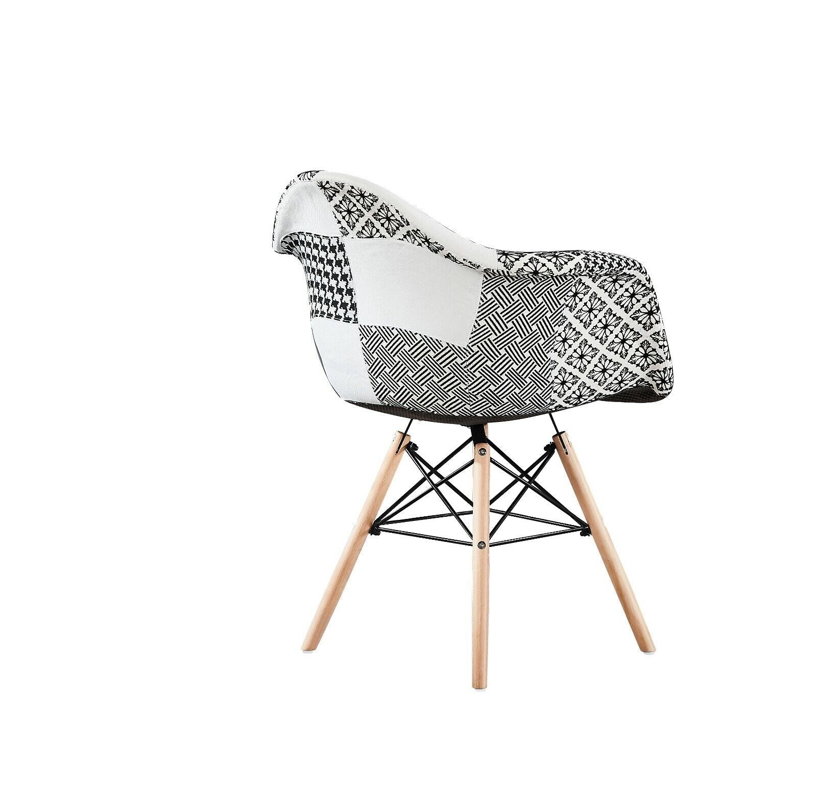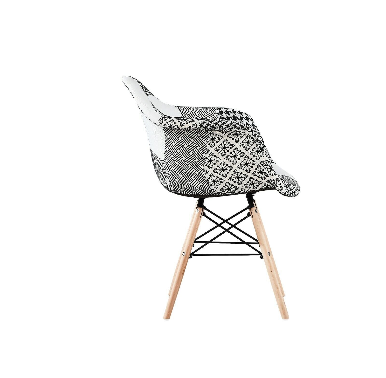 The real showstoppers are the patchwork chairs - each uniquely upholstered in a mix of monochrome patterns that add character and creativity to your space. Designed for comfort and stability, these chairs feature molded ergonomic seats, built-in armrests, and soft foam padding. The natural wooden legs are supported by black powder-coated cross-bracing for a mid-century-inspired edge that’s as sturdy as it is stylish.