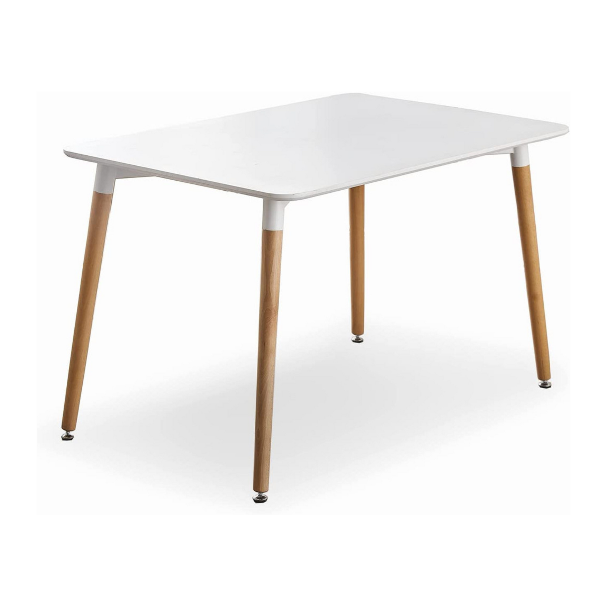 - Glossy white laminated tabletop with solid wood legs
