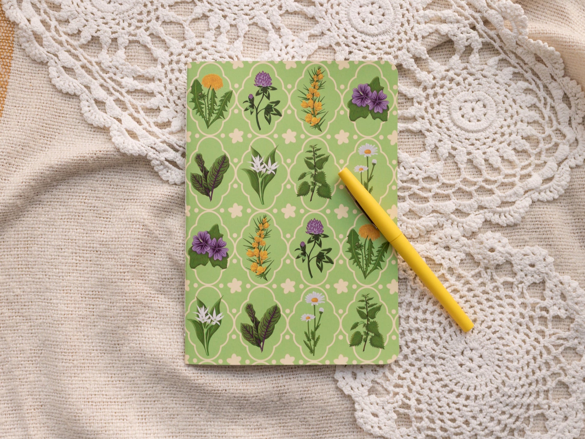 Step into spring with this colourful notebook design featuring local plants such as dandelion, ox-eye daisy, clover, gorse, mallow, nettle, sorrel and wild garlic. All of these plants can be foraged in the UK.