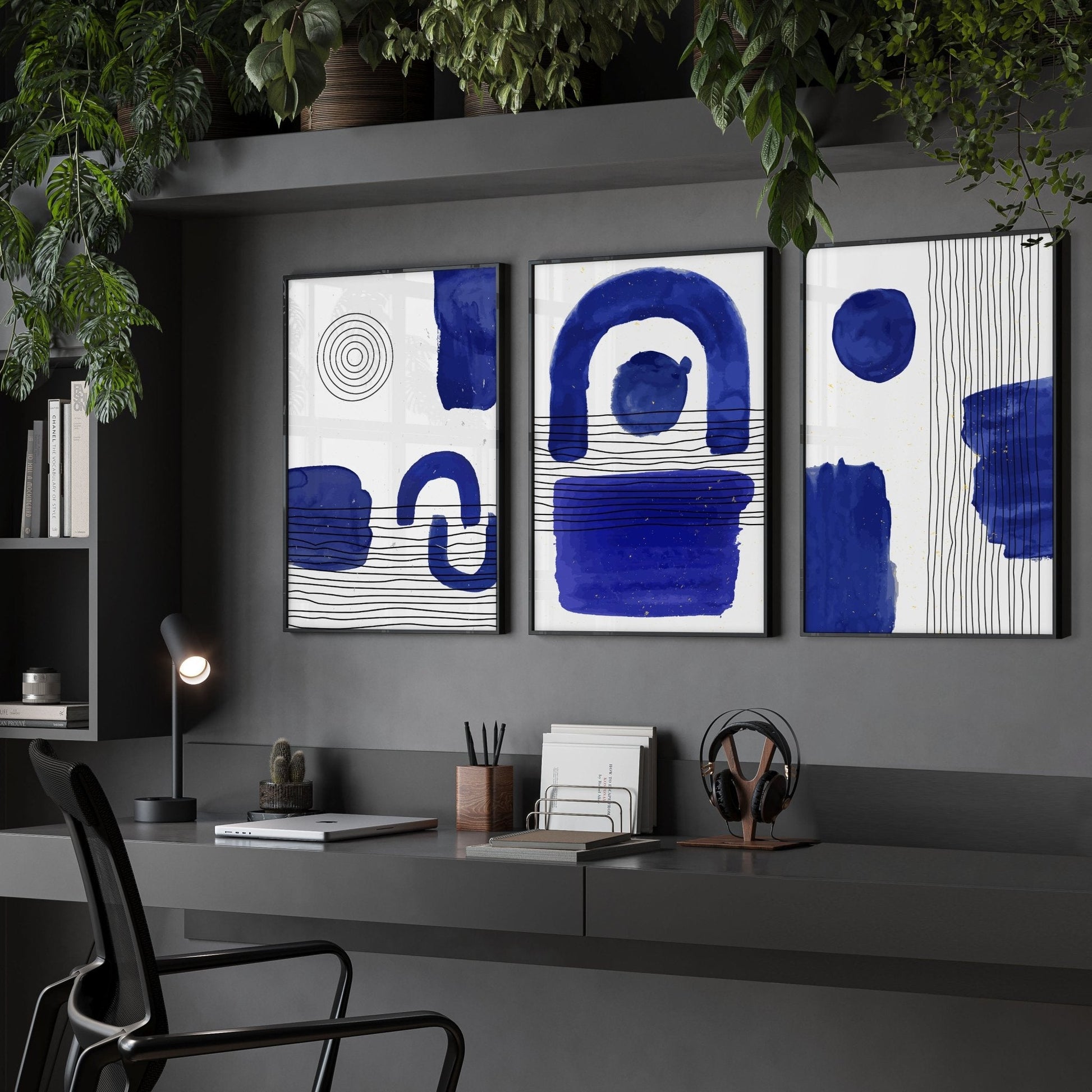 Energise your space with our Abstract Framed Wall Art, a set of 3 abstract wall art prints designed to transform your office wall decor into an inspiring oasis. The harmony of the blue wall decor palette with mesmerising abstract designs creates a captivating visual narrative, adding a modern touch to any room.