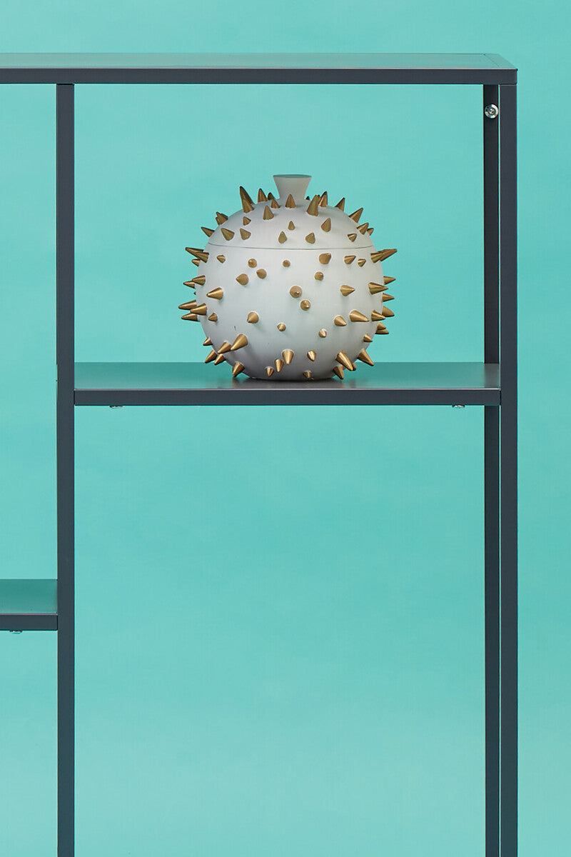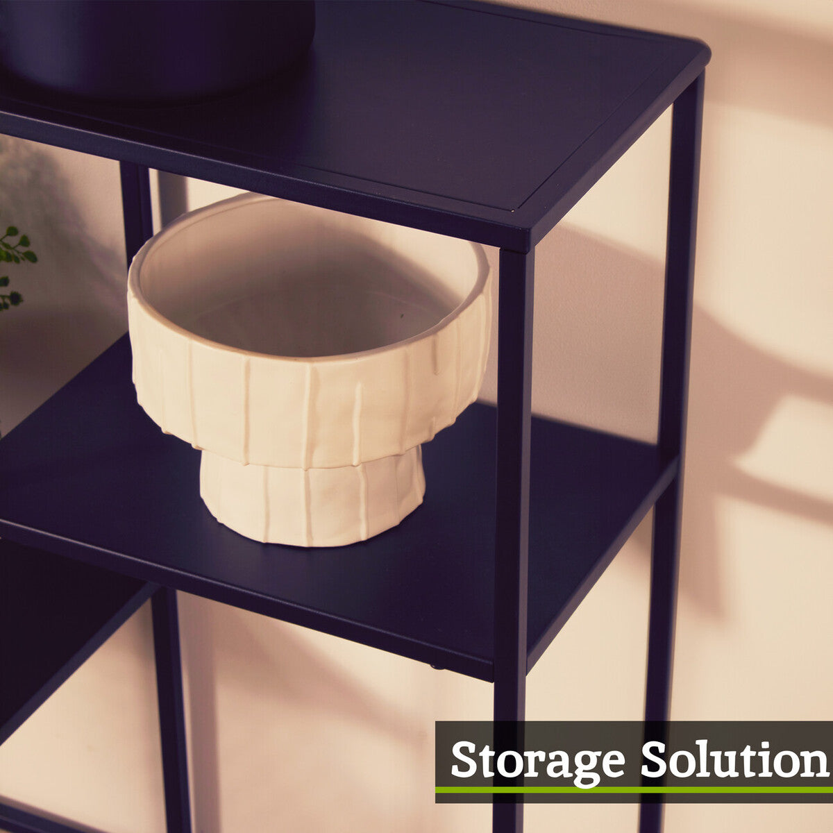 Crafted from strong and sturdy metal with grey powder coating, this sleek storage unit has multiple different sized shelves that helps you keep your home and office clutter-free and tidy. The clean lines, openwork, and minimalist look of this metal shelf unit brings an industrial touch to your space.