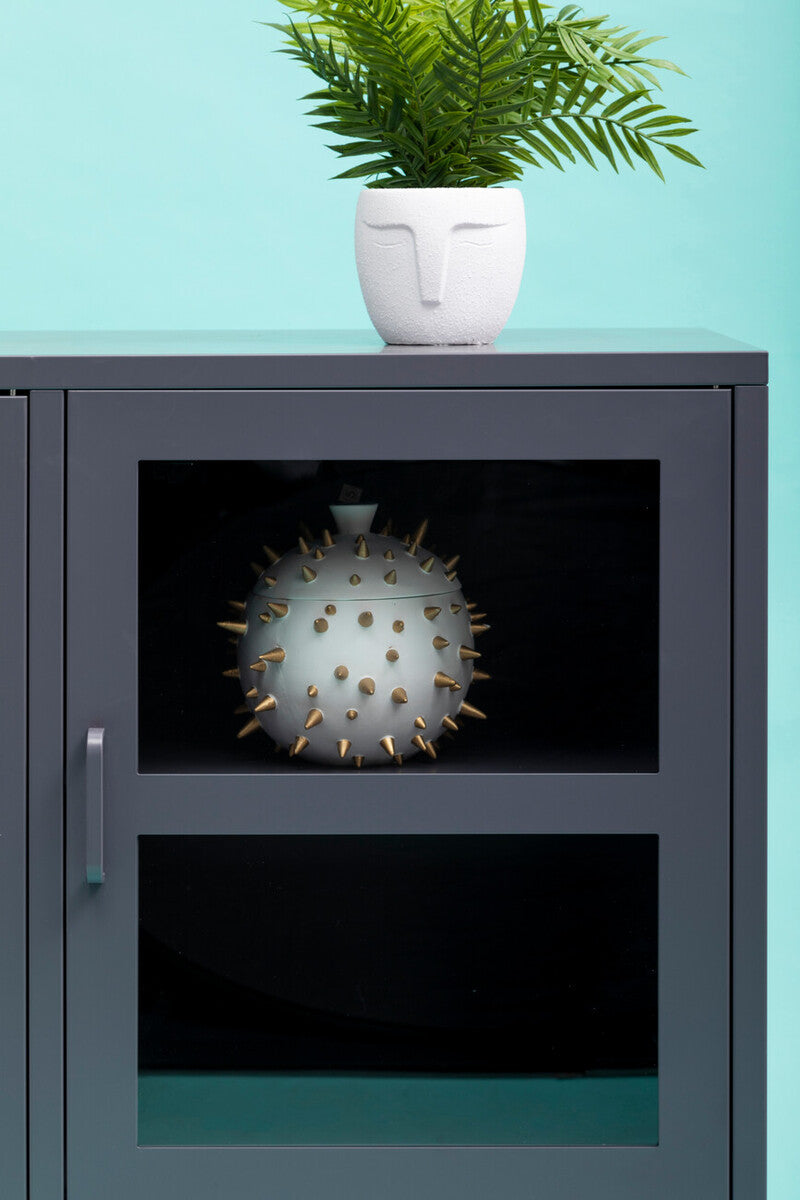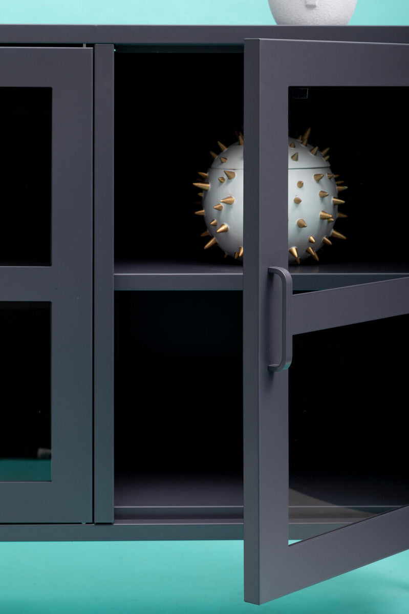 Boasting an industrial charm, this metal sideboard features a muted grey powder coating that further enhances its clean look and adds a protective layer to prevent corrosion and rusting. This grey sideboard is equipped with three clear tempered glass doors that allow easy inspection and compliments the modern look, making it a stylish and functional addition for modern and contemporary living spaces and entryways.