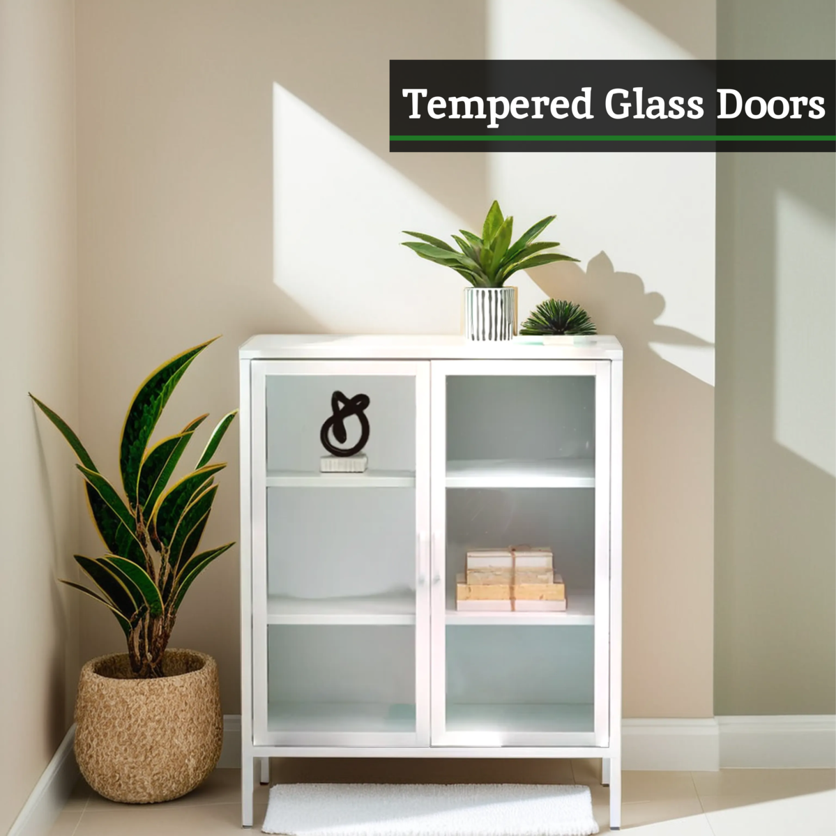 Clear tempered glass doors present books, ceramics, and glassware while keeping dust at bay. The metal body offers reassuring strength for daily use, and the pared-back profile suits modern and loft-inspired interiors. Subtle framing around the doors' heightens the minimalist look and draws attention to your curated display.