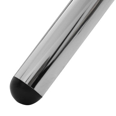 This dining table has a clear glass top that lends it a contemporary and airy feel. Made of metal, it features a cross base with four angular legs in a silver finish which add stability and provide a solid foundation to the glass top.