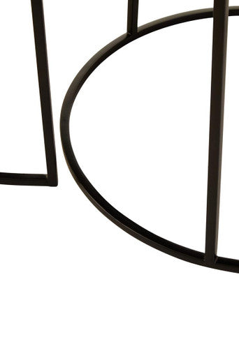 Each round top combines a textured metal frame with antiqued glass at the centre for layered reflection. The legs are made from black steel with a smooth finish that resists routine handling. Hand finishing ensures nuanced surfaces that feel crafted rather than uniform.