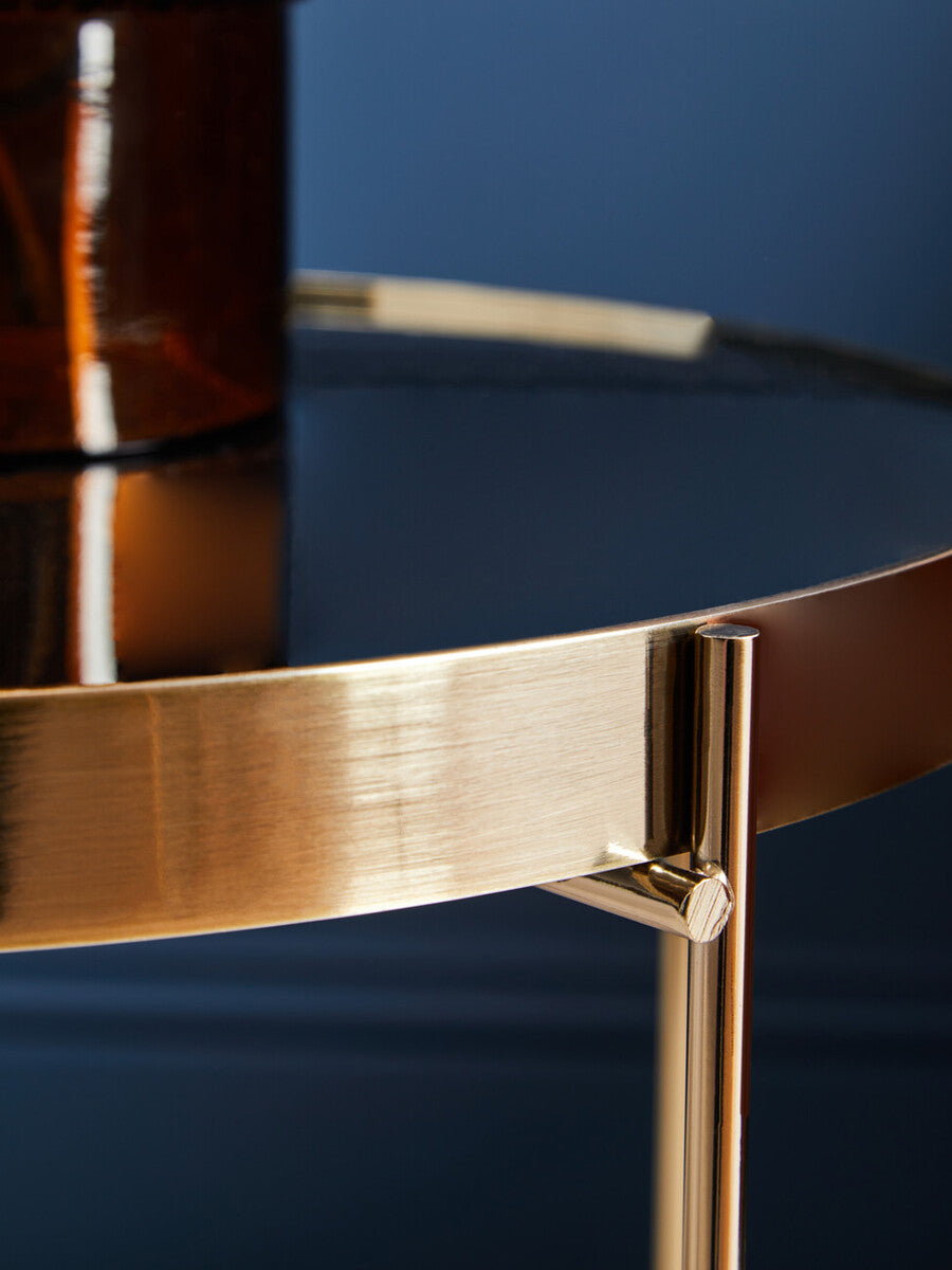 Orsina grounds reflective design with a compact profile in the Allure Black Mirror Low Side Table. The Black Mirror Side Table features a round black mirrored top nested in a brushed bronze band, supported by four tubular legs for a minimal, composed look.