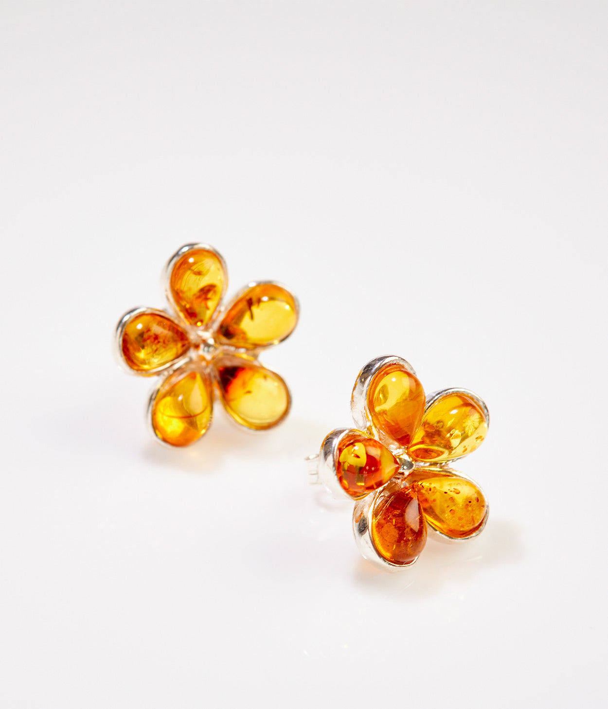Daisy Stud Earrings featuring a pretty flower shape with 5 amber petals. Handcrafted with sterling silver and baltic amber for everyday wear.