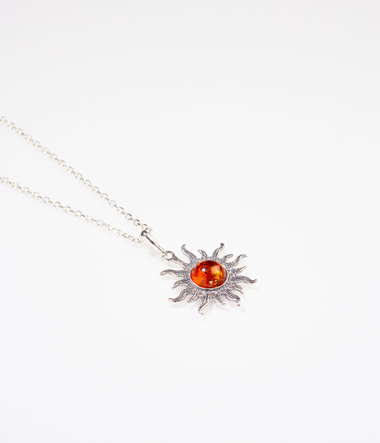 This sun charm pendant has been made with incredible attention to detail. The sterling silver rays are carefully shaped with very intricate surface detail. The amber centrepiece is rounded-off at the top and flat on the reverse - meaning that it catches the light offering a deep fiery cognac colour.