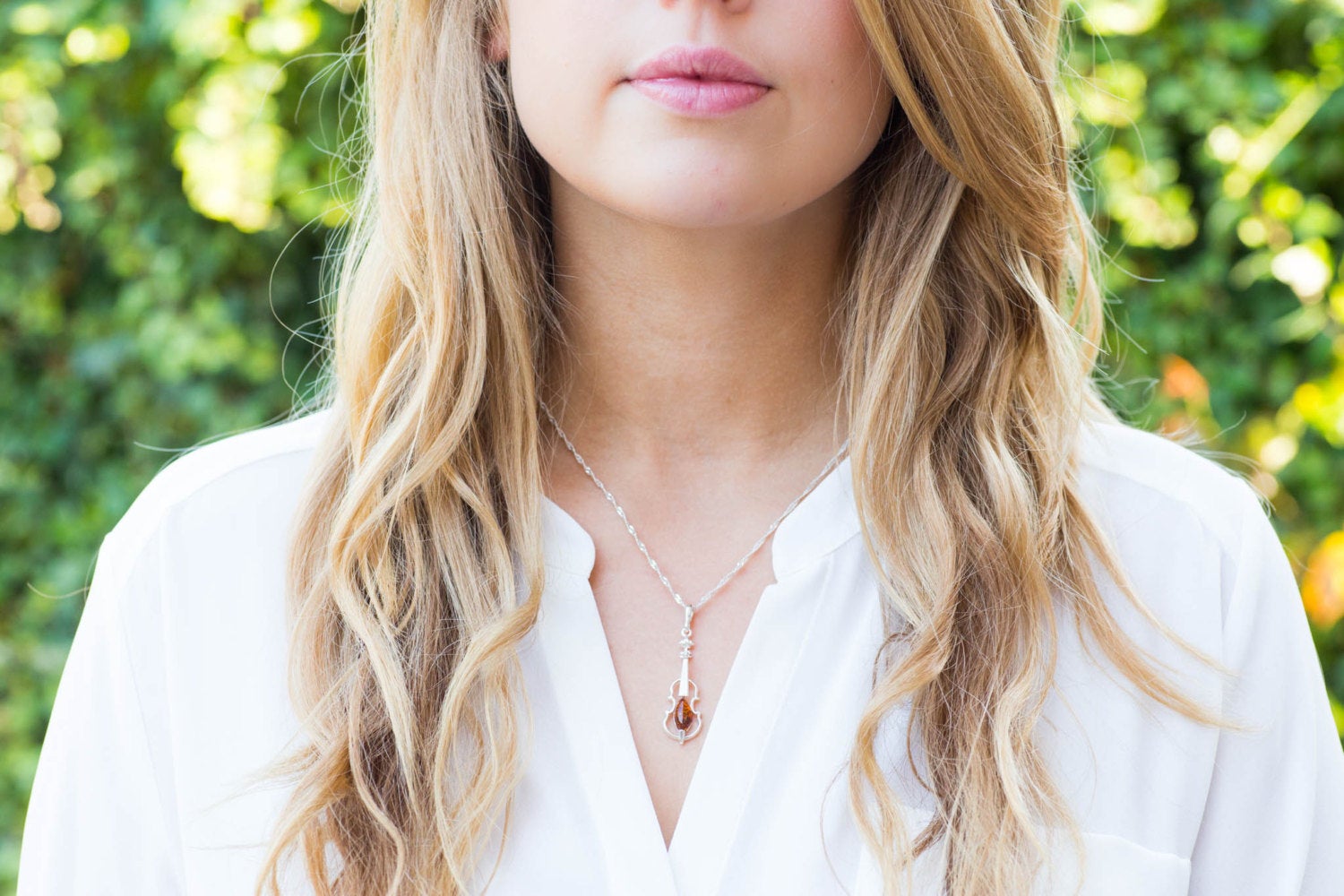 Featuring a delicate violin outline crafted with sterling silver and detailed with radiant amber gemstones.