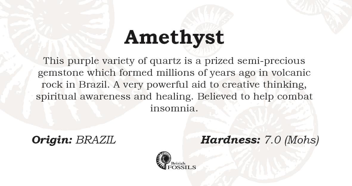 This gorgeous purple Amethyst is a violet variety of quartz and comes with an information card with the following facts about the semi-precious gemstone: