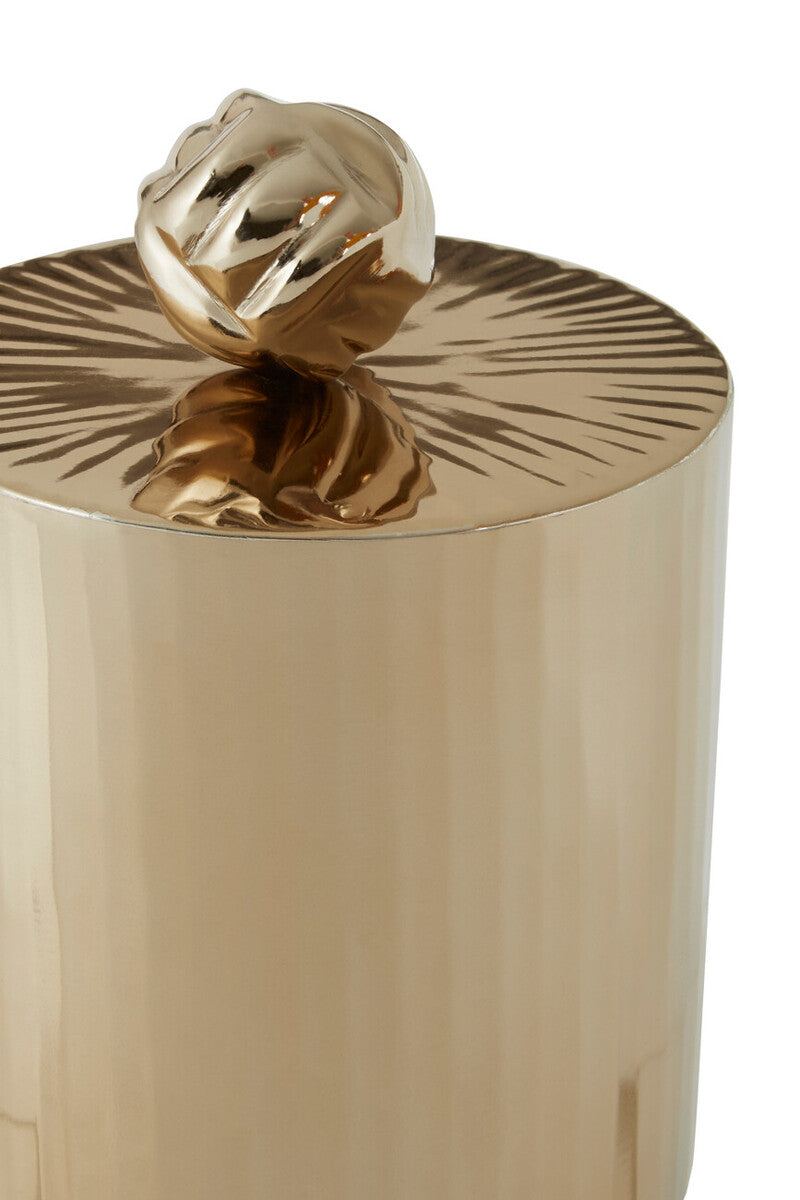 - Warm gold finish and sleek lid with knob
