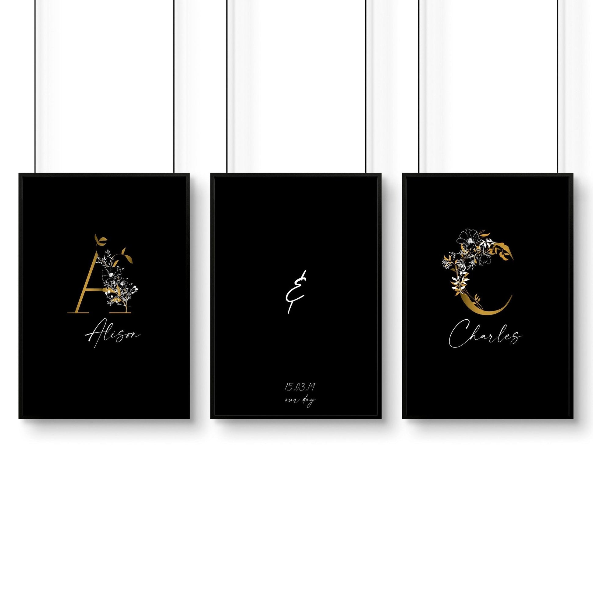 Celebrate the love and journey of a special couple with our Anniversary gift for one year Couples. This set of three wall art prints features a stunning Botanical Monogram design set against a black background with elegant accents of white, black, and gold.