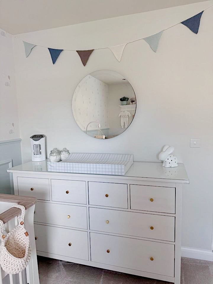 Our powder blue gingham wedge baby changing mat is a classic design that will add a touch of luxury to your baby boys' nursery. We also have this print in our PVC Basket Liner and our Deluxe Baby Changing Mat.