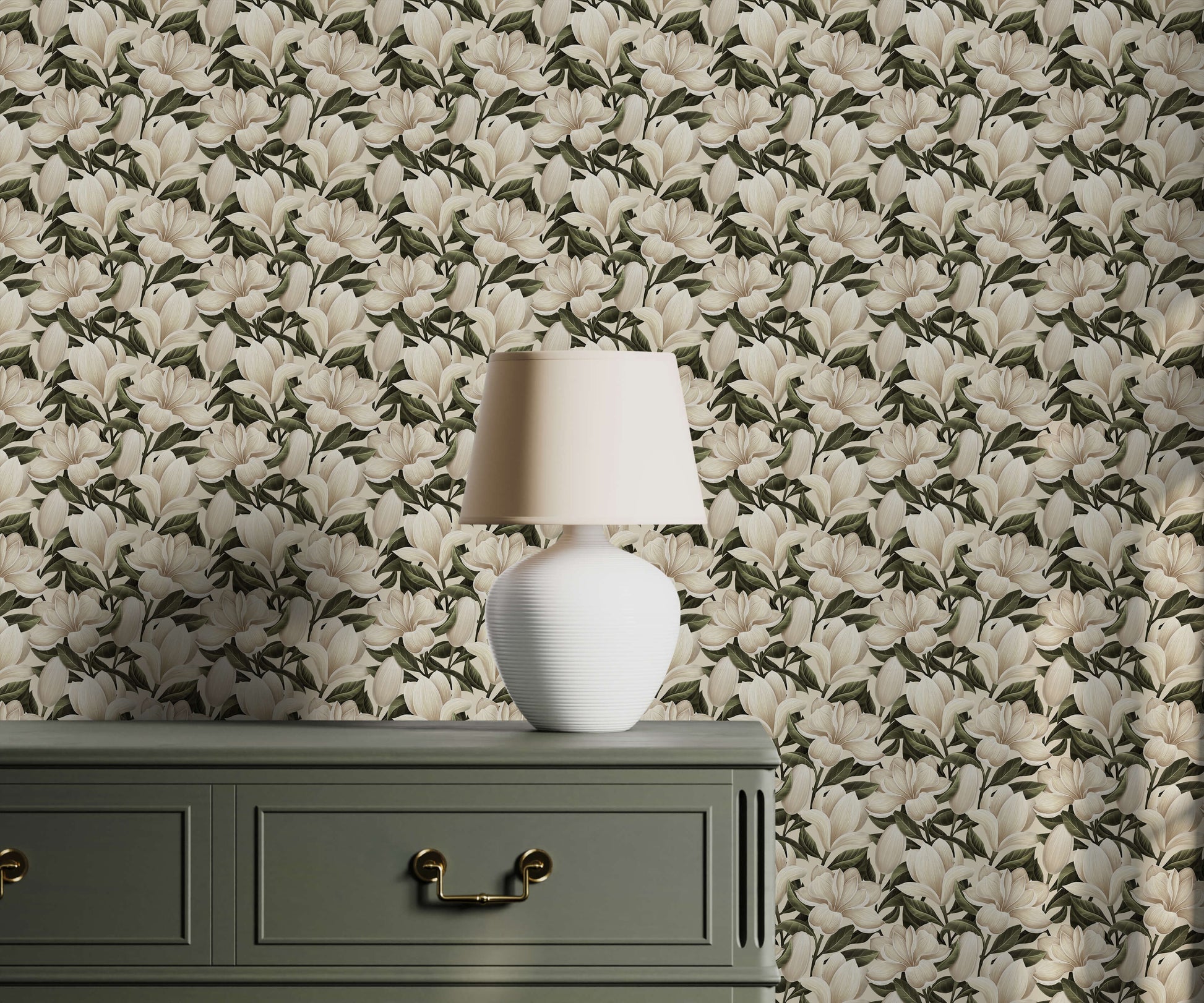 The magnolia floral wallpaper is a dense and opulent botanical design, celebrating the dramatic beauty of the fully opened magnolia flower. The pattern features a highly intricate, repeating motif of large, creamy blossoms intertwined with deep, rich foliage. This tight arrangement completely covers the wall surface, creating a fabric-like tapestry of flora and leaves that feels both abundant and traditionally elegant.