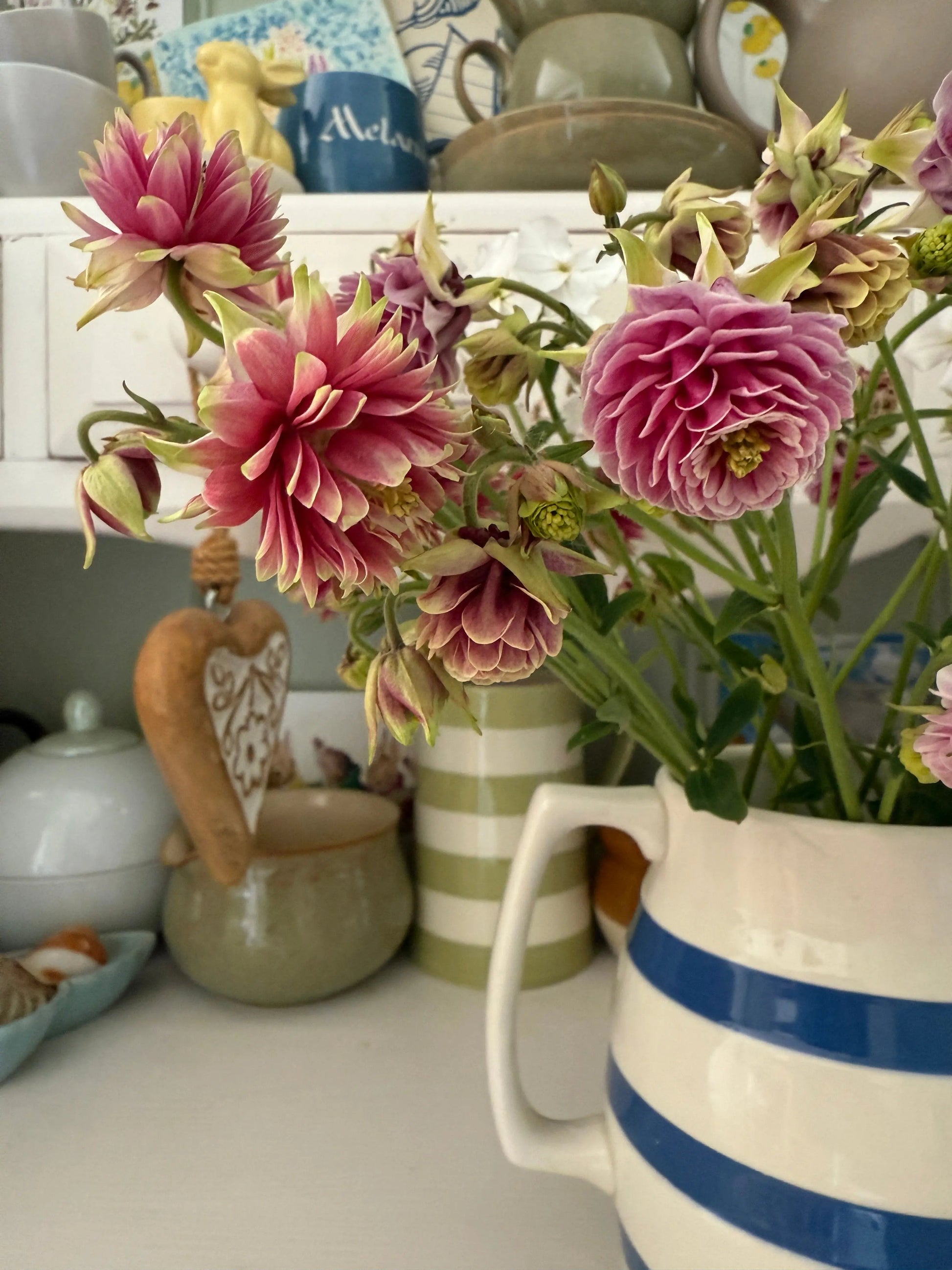 Three things make the most of 'Nora Barlow'. First, sear cut stems in boiling water for ten seconds immediately after cutting — aquilegia stems are hollow and prone to air lock, which causes wilting within hours. The ten-second boiling water treatment seals the stem end and allows the plant to draw water properly; it is the difference between a cut stem that wilts in a day and one that remains beautiful for four to six days. Second, watch the green tips develop as the flower matures — the lime-green intensifies slightly as the raspberry-pink fades toward cream at the petal edges, and a flower that is all-pink in bud is subtly and beautifully three-toned — pink, cream, and green — by the time it is fully open. The green is most visible and most striking close up, and 'Nora Barlow' more than any other aquilegia rewards the attention of looking very closely. Third, deadhead consistently if you want to maintain the variety's characteristic colouring in self-seeded offspring — allow open cross-pollination with other aquilegias and the distinctive green-tipped pink-and-cream of 'Nora Barlow' will gradually dilute in subsequent generations.