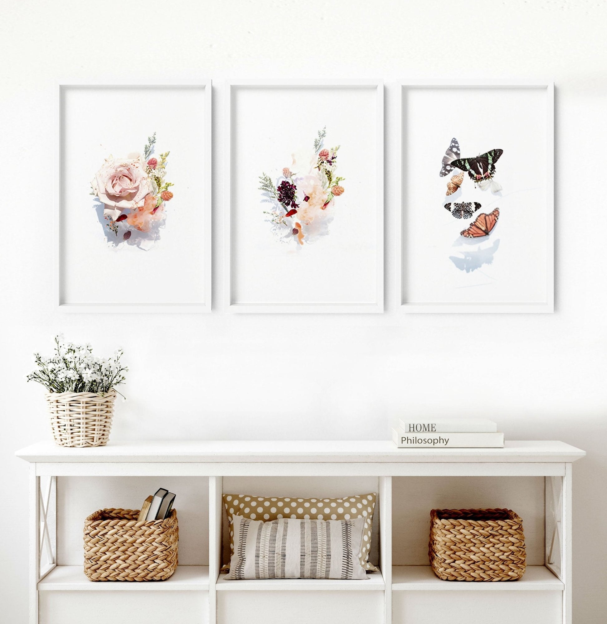 Elevate the charm of your living room with our enchanting set of three wall art prints. This art set fuses Roses and Butterflies in a Shabby Chic style, adding elegance to living room decor. A soft palette brings nostalgia, tranquillity, and a warm and inviting atmosphere to the living space.