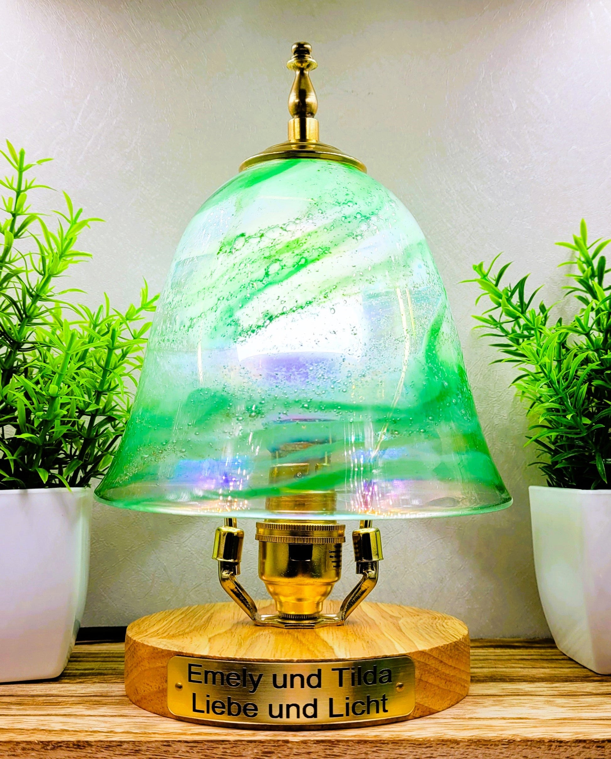 Illuminate cherished memories with our memorial glass table lamp, available in various colours. The wooden base features a personalised engraved plaque with your heartfelt message.
