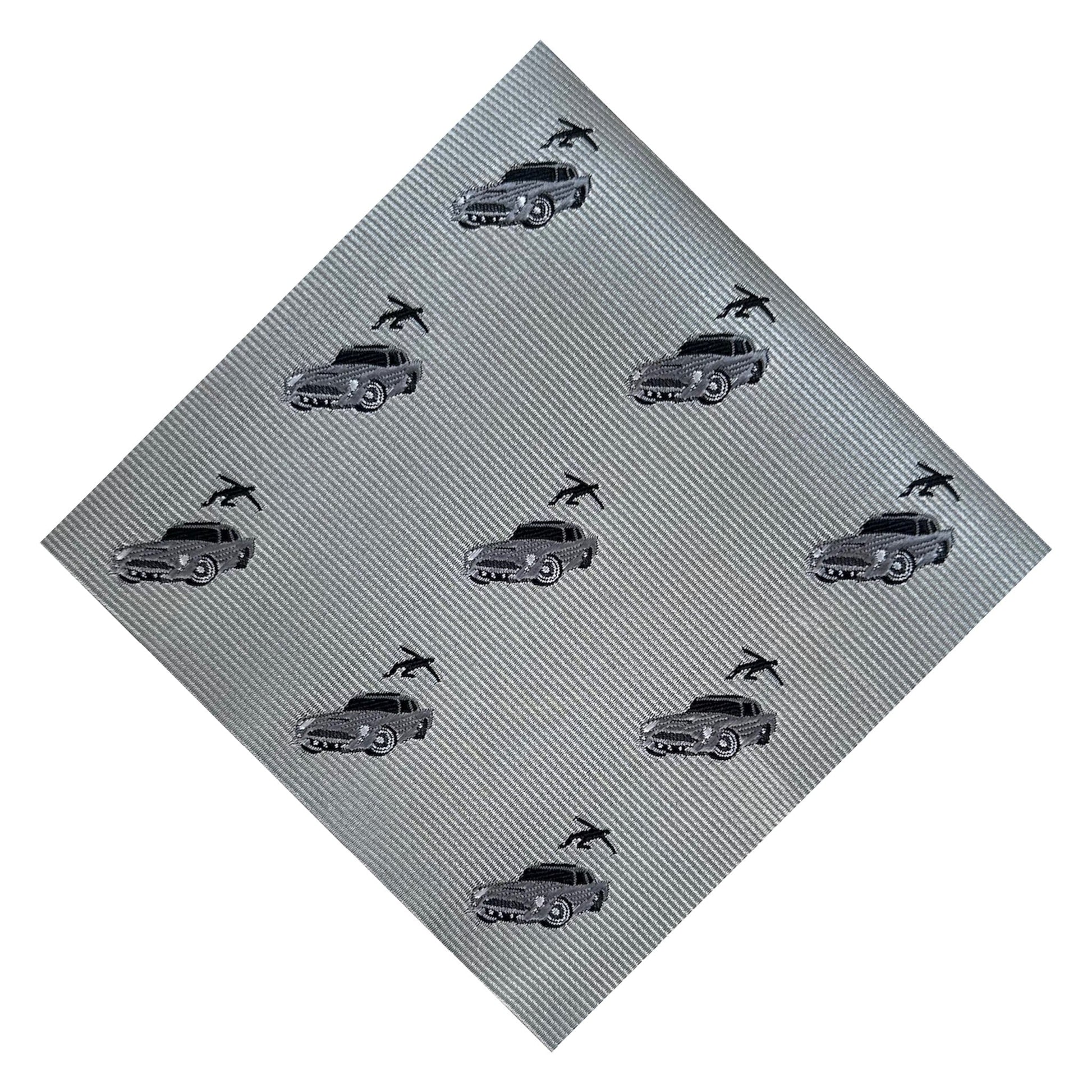 A sharp pocket square paying homage to the iconic Aston Martin, complete with a sophisticated nod to its skyward launching ejector seat.