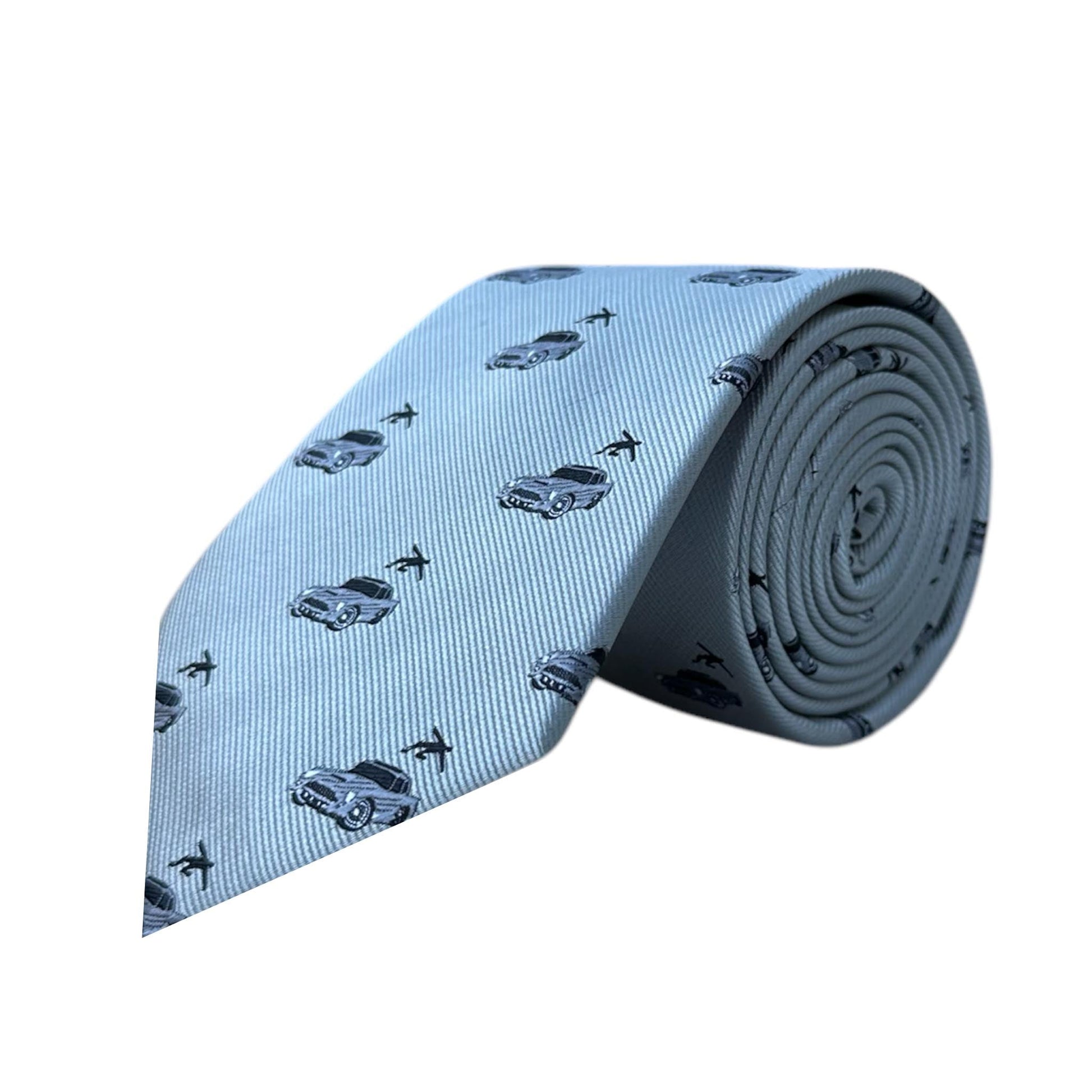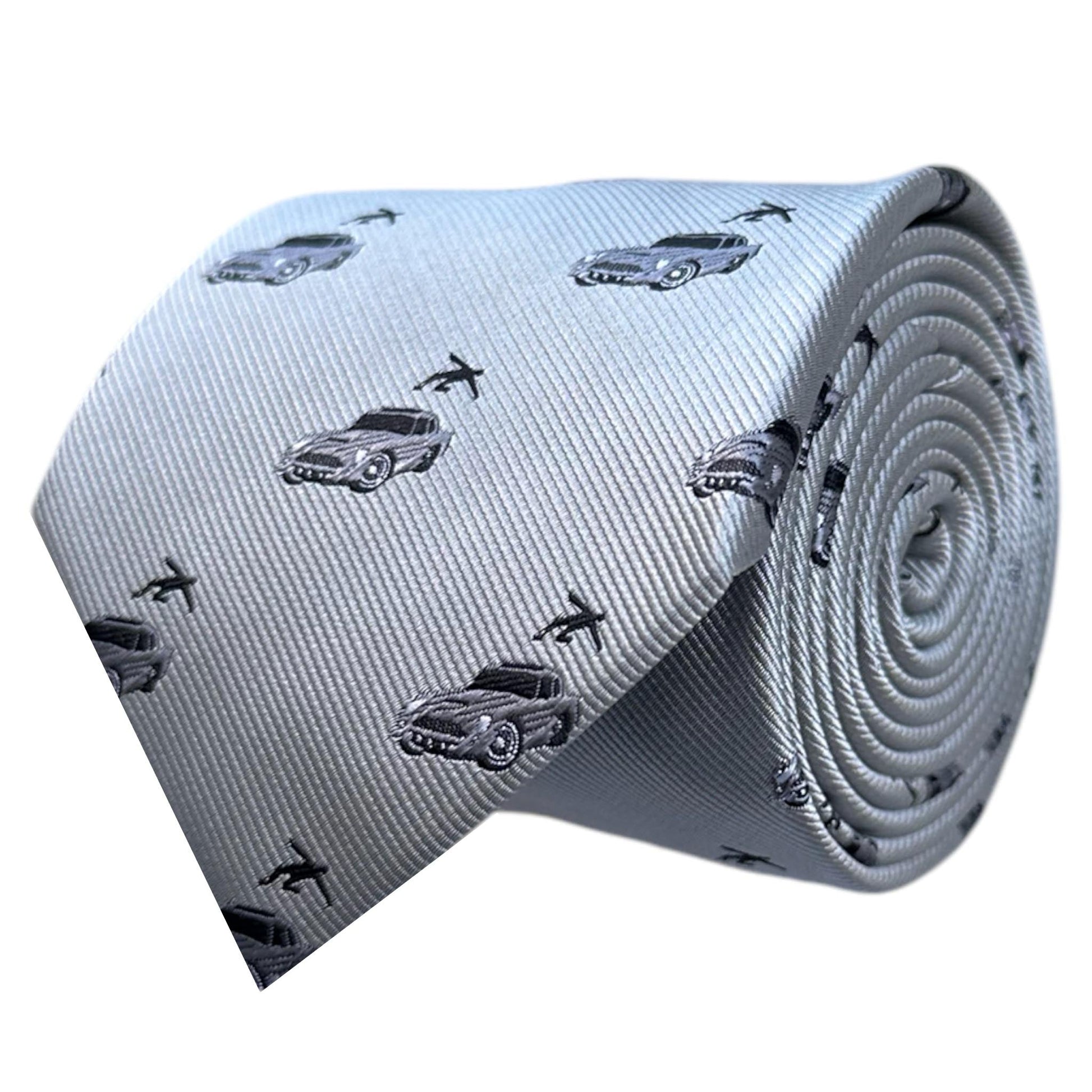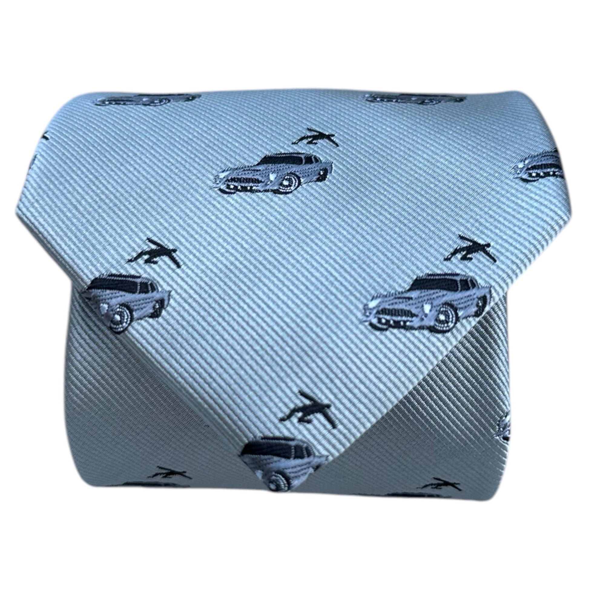 A sharp necktie paying homage to the iconic Aston Martin, complete with a sophisticated nod to its skyward launching ejector seat.