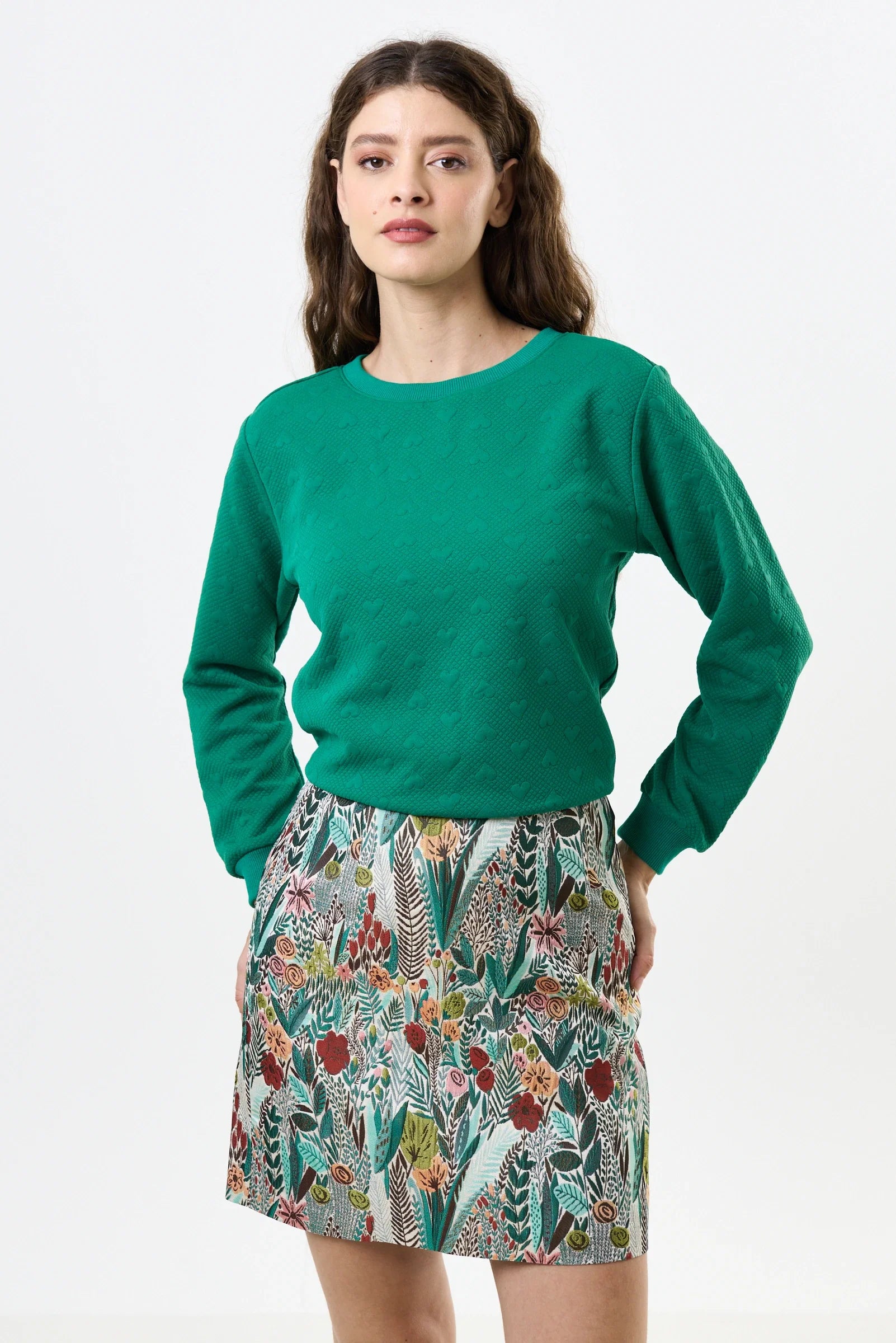 Elevate your wardrobe with our Aubin jungle jacquard A-line mini skirt. Crafted in an intricately woven leafy jungle jacquard. Pair with the matching Salut jacket for a chic event-ready co-ord, or keep it low key with the Jan heartfelt sweat. Either way this skirt is sure to make a statement.