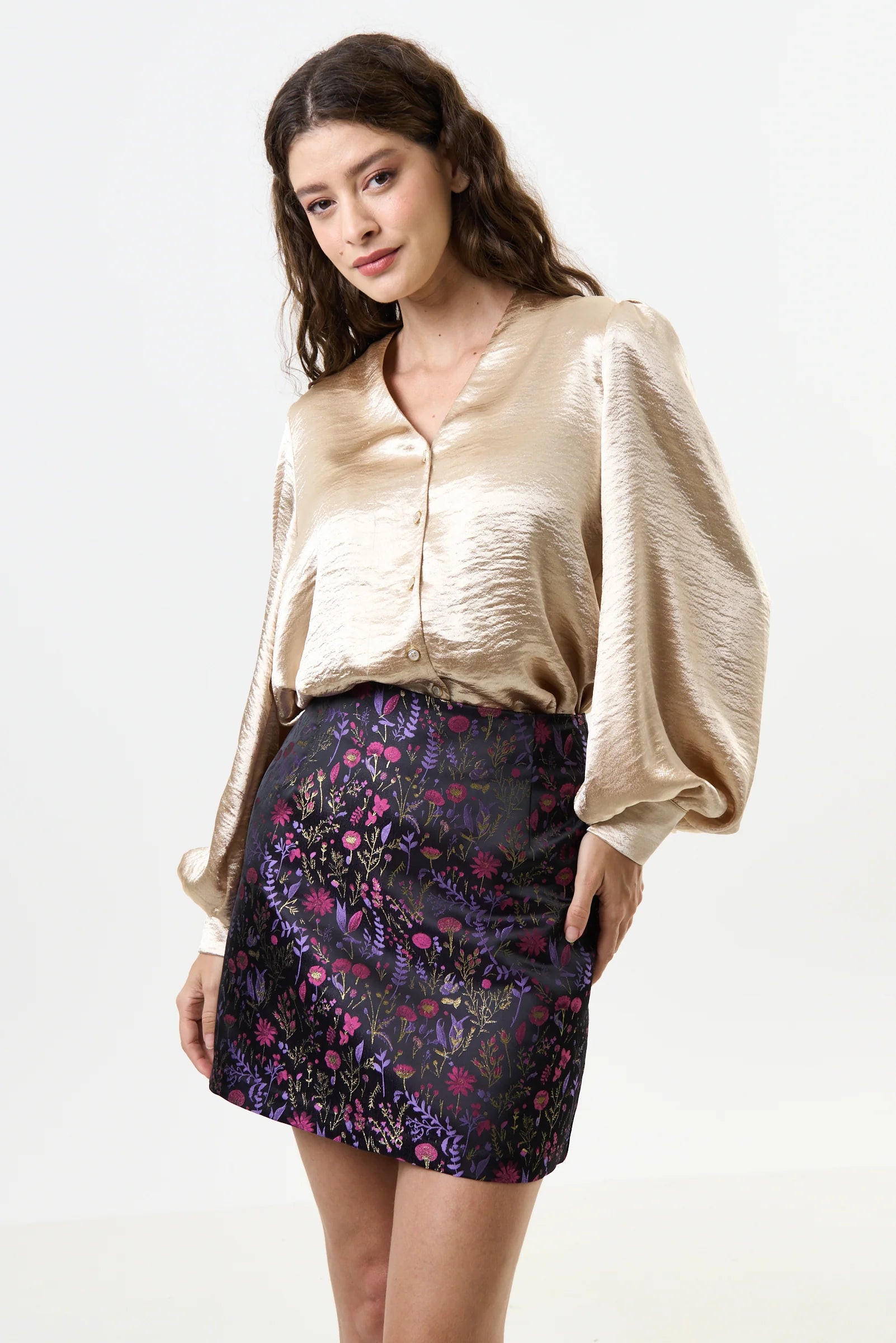 Add a touch of magic to your outfit with our Aubin magic forest Jacquard mini skirt in sparkling with an electric pink hue. This A-line skirt is crafted in an intricate floral woven jacquard that will stand out in any crowd.