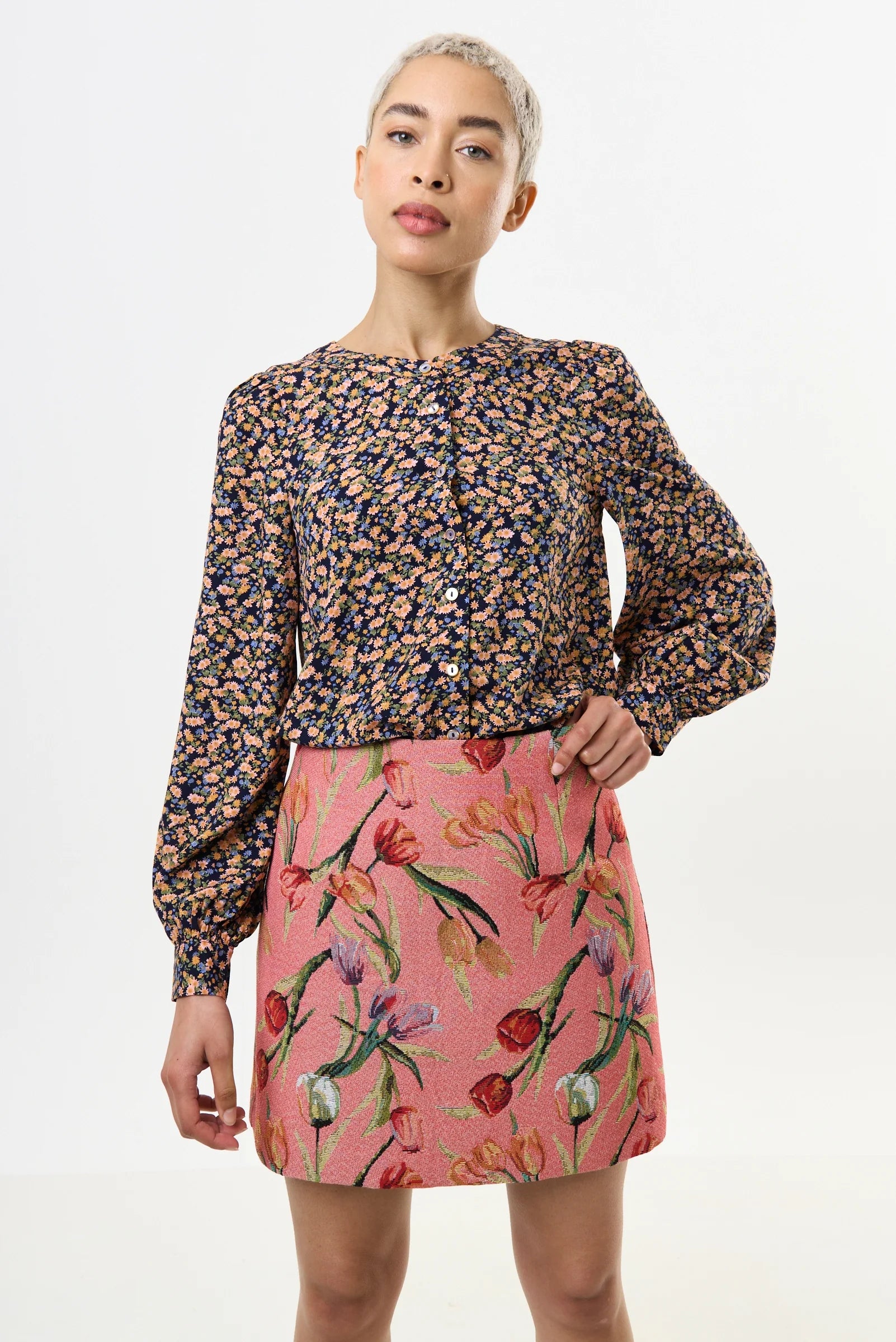 Spring into style with our Aubin Tulip Jacquard A-line Mini Skirt! Crafted in an intricate woven tulip jacquard, this skirt will get you noticed for all the right reasons.