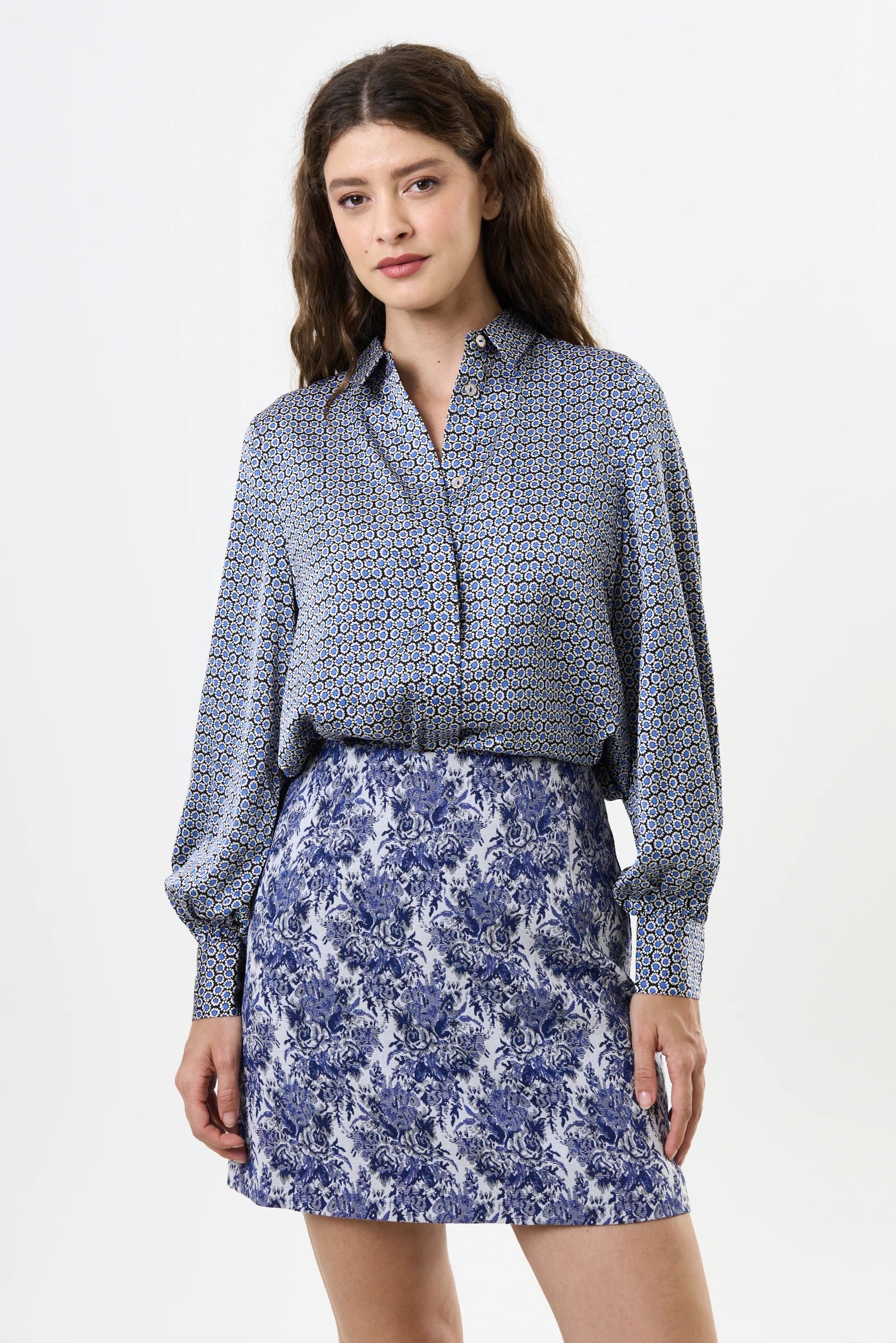 "Get a vintage-inspired look with our Aubin Wedgwood Jacquard mini skirt. This A-line skirt features a pattern inspired by the Wedgwood potteries, giving it a touch of history and elegance. Woven using traditional techniques, this skirt is sure to be a timeless addition to your wardrobe.