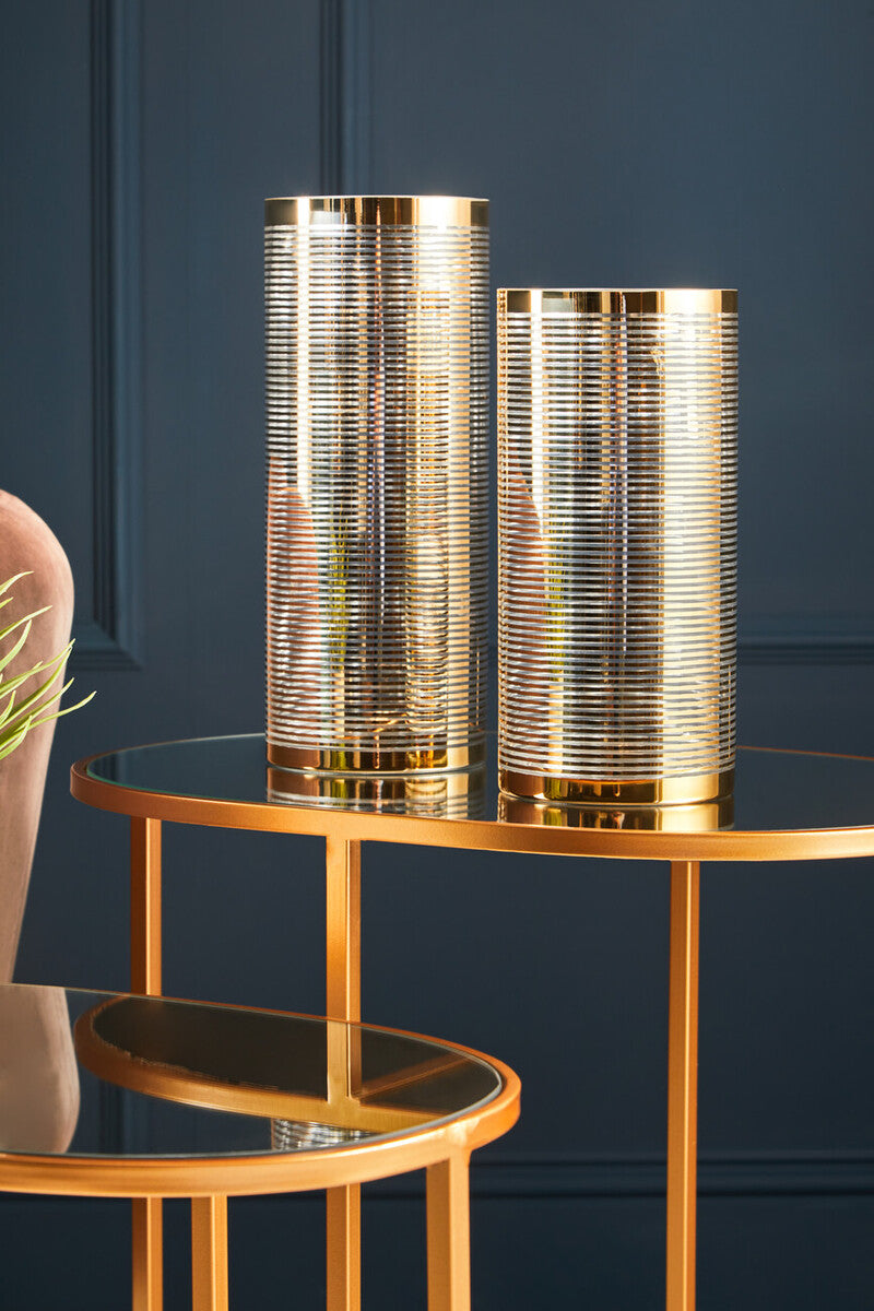 Soft curves, strong style The Avantis Set of 2 Oval Side Tables introduces gold oval frames topped with gleaming mirrored glass. The oval form adds gentle movement that contrasts beautifully with linear sofas and angular armchairs, while the reflective tops brighten corners and show off your favourite decor pieces.