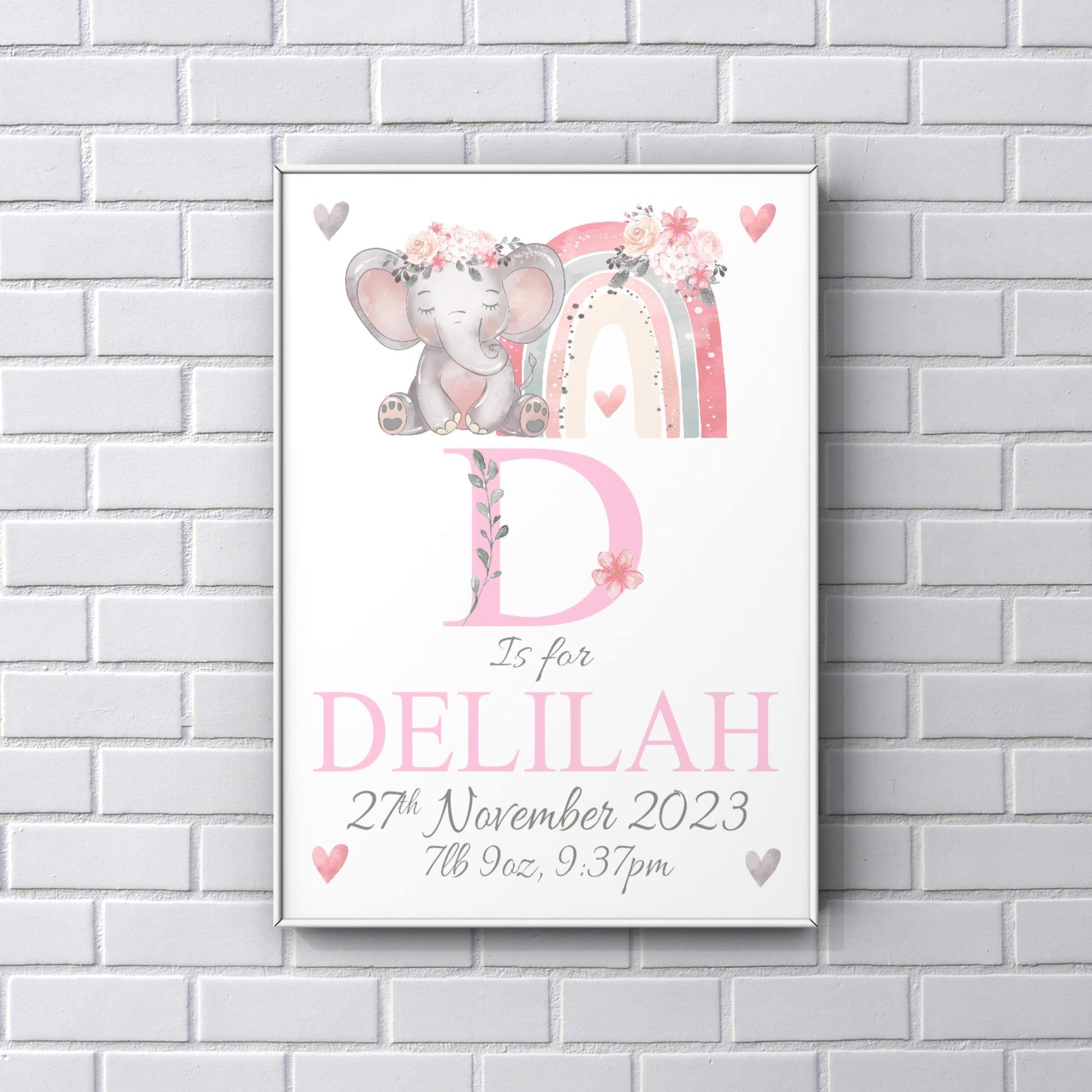This adorable baby girl newborn print featuring an elephant is a perfect way to celebrate the arrival of your precious little one. The sweet elephant, with its soft, pastel tones and endearing features, symbolizes strength, wisdom, and love—qualities that will guide her throughout her life. Surrounded by whimsical details and personalized with her birth information, this print becomes a timeless keepsake to treasure for years to come. Ideal for a nursery, it brings warmth and charm to any space.