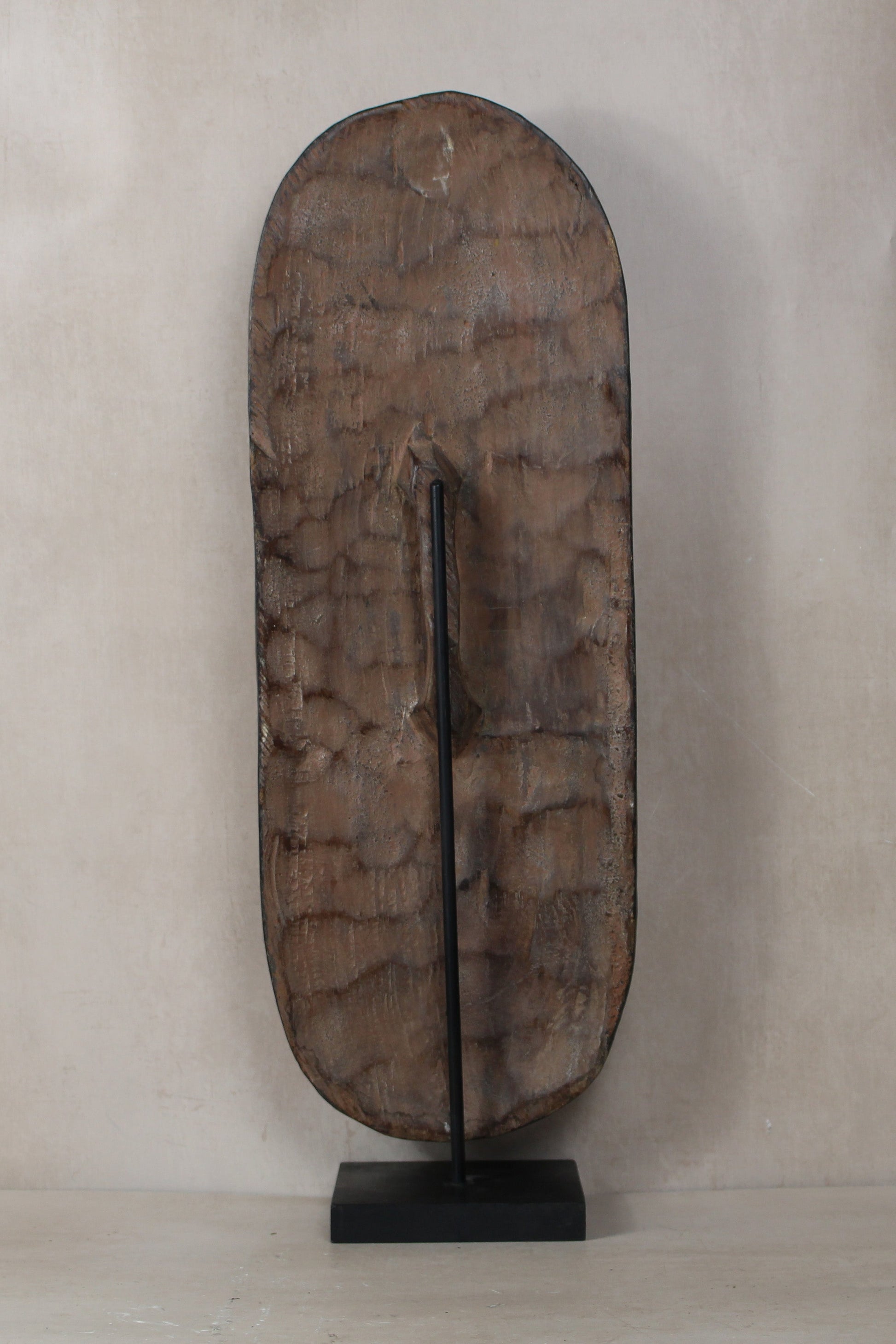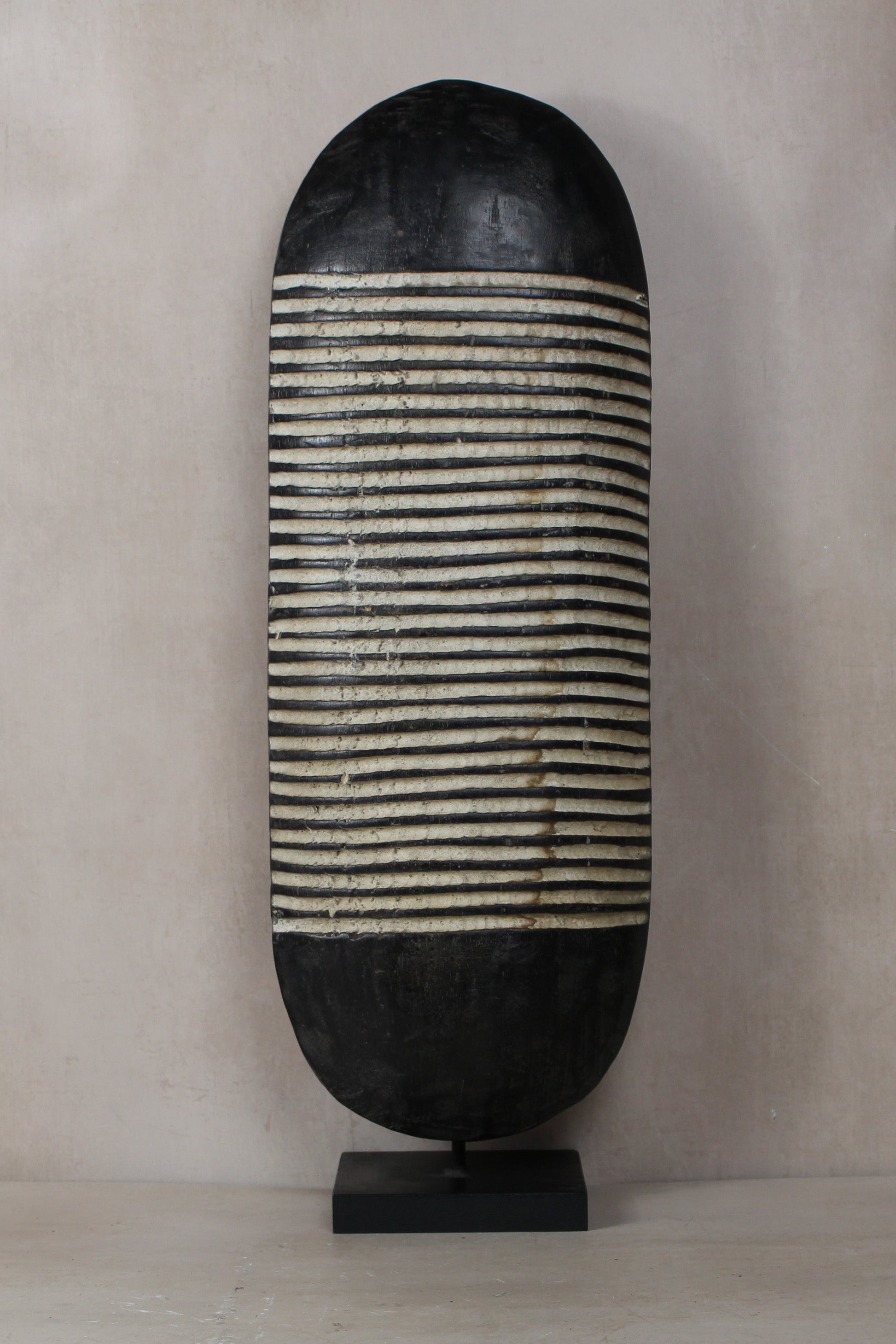 The Bamun shield bridges the gap between ancient cultural heritage and contemporary design. Its neutral tones and strong linear movement allow it to complement a variety of styles, from Biophilic and Japandi to Modern Industrial.