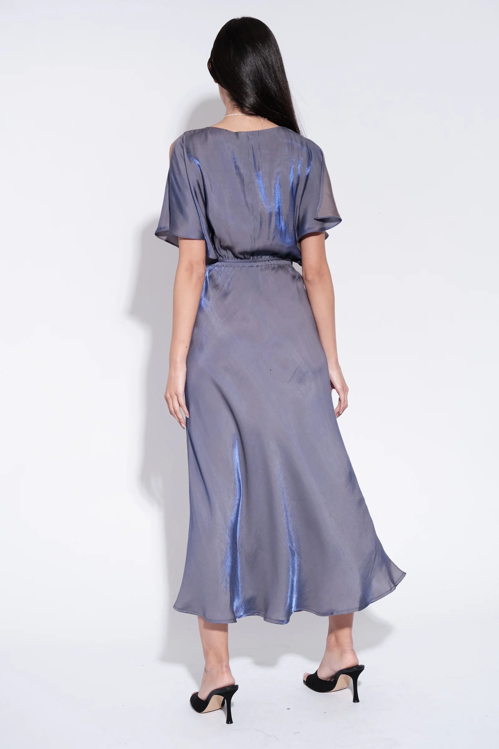 Say hi to Basford the show stopping iridescent cape sleeve midi dress. Crafted with a luxe, iridescent silver-navy fabric, this bias-cut midaxi dress will have you sparkling with each step. A self-belt and an elasticated waist lend a flattering and feminine shape to the silhouette. Feel fabulous and unforgettable in this dress.