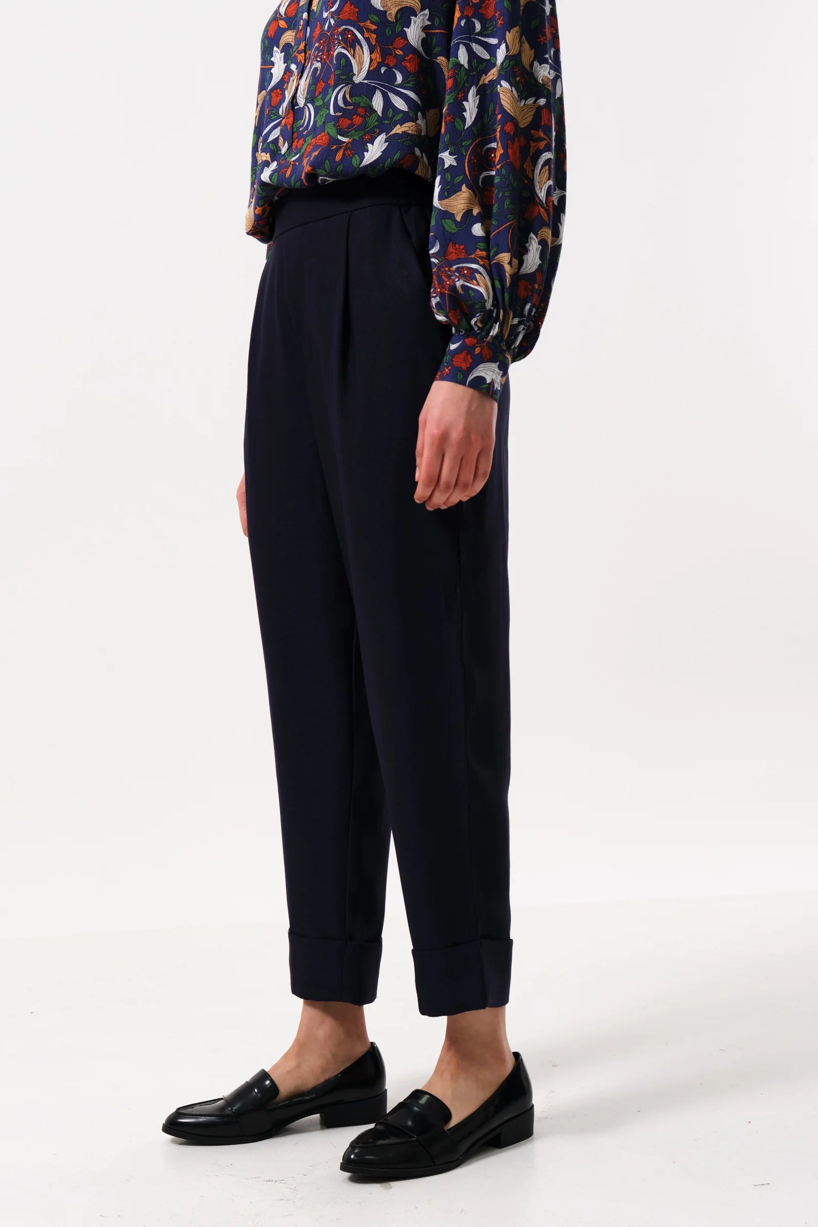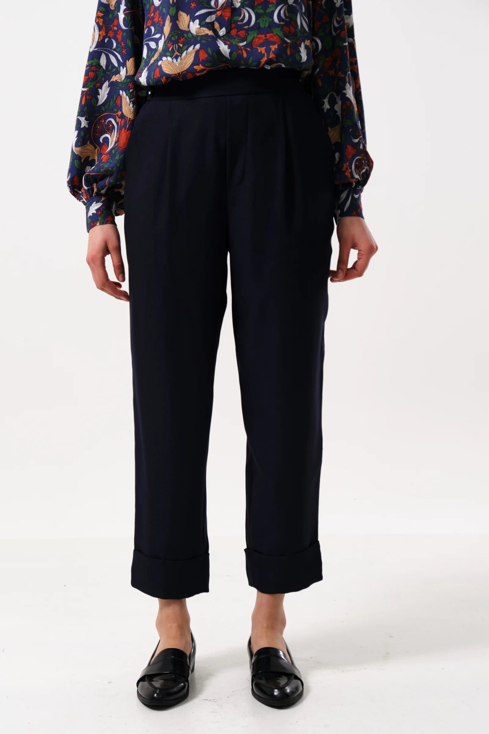 Introducing the Bayeux navy satin back crepe trouser - a stylish, environmentally conscious choice. Made with soft satin back crepe, these cropped trousers feature an elasticated back waistband for comfort and a deep turn up for added style. Choose sustainability without sacrificing style!