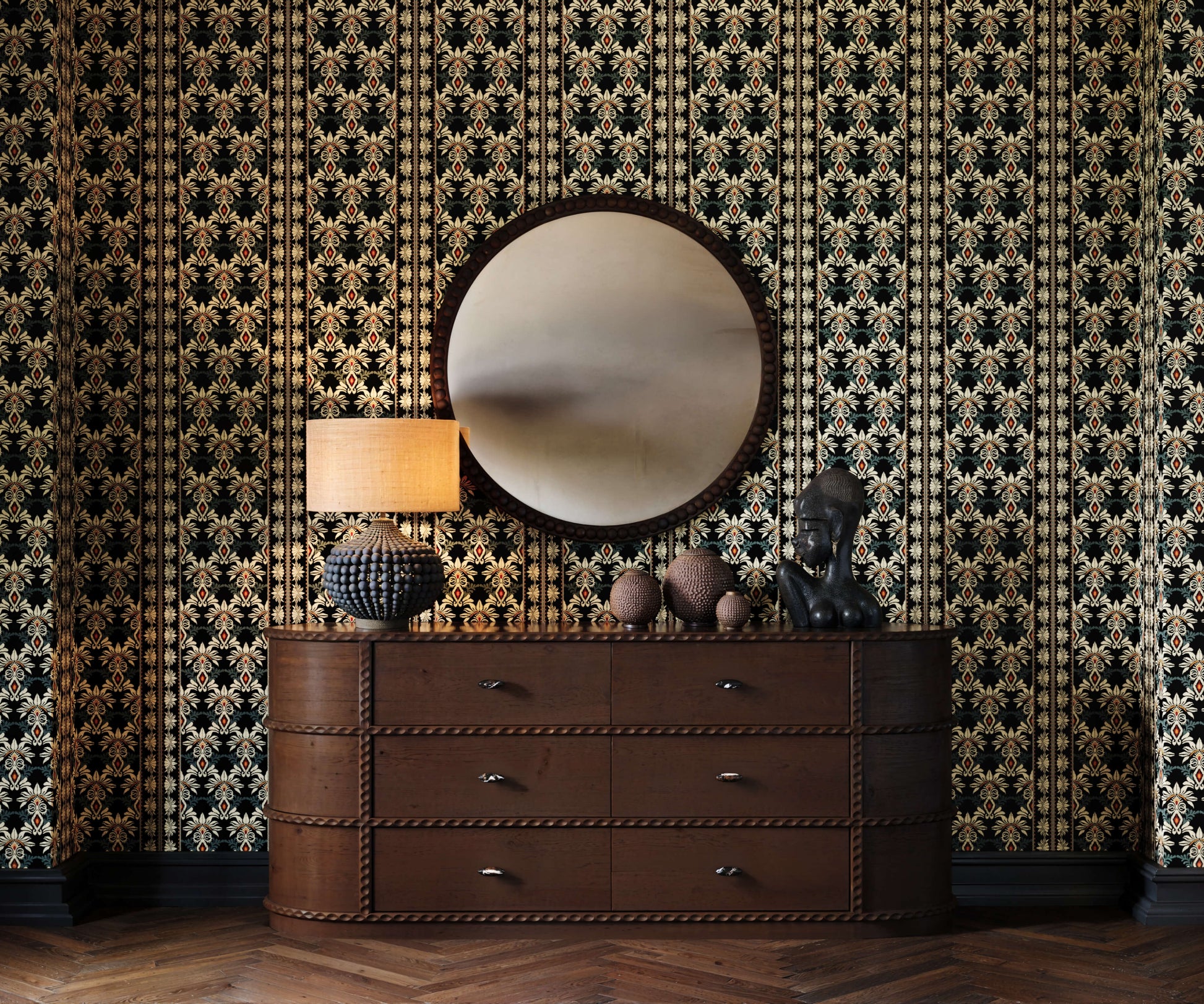 The Ottoman wallpaper brings a rich sense of history and opulence to any space, inspired by the intricate patterns and luxurious designs of the Ottoman Empire. This design features ornate floral motifs and elegant scrollwork, repeated in a rhythmic, vertical arrangement that adds both structure and refinement to the overall look. The combination of detailed elements and bold contrast creates a striking visual that feels both timeless and regal. Perfect for adding a touch of grandeur to any room, this wallpaper transforms the atmosphere with its sense of deep tradition and artistry. Ideal for formal spaces or for creating a statement wall, the Ottoman wallpaper blends historical elegance with a sophisticated, decorative flair, making it a beautiful choice for those seeking to introduce a luxurious and exotic touch to their interiors.