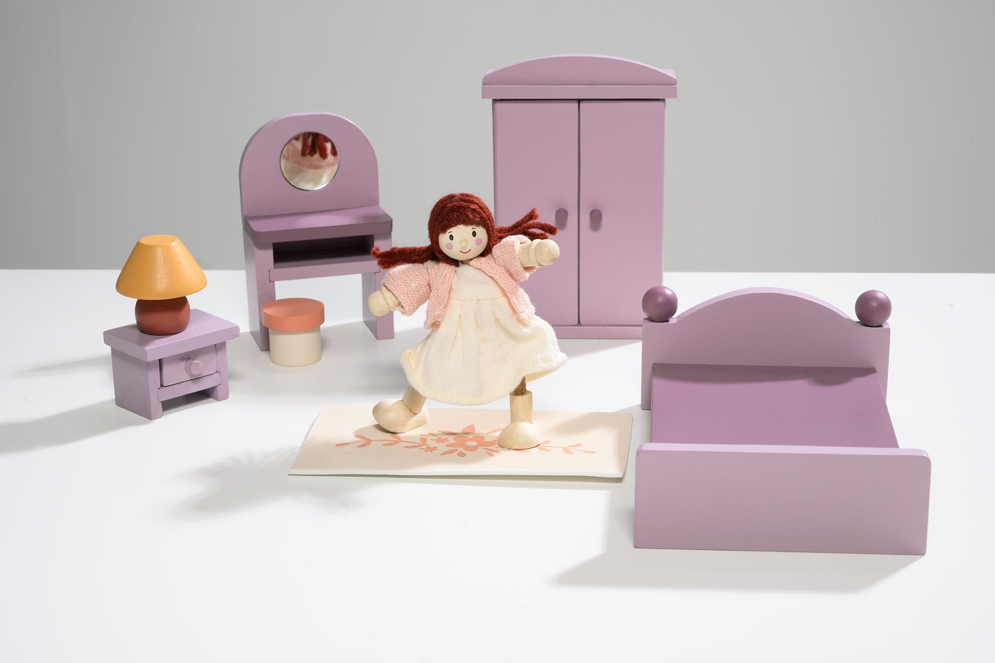 This pretty wooden doll's house furniture set includes a double bed, a bedside table with lamp, a dressing table and stool, a wardrobe with opening and shutting doors, and a printed rug. Compatible with both Mentari and Tender Leaf dolls houses.