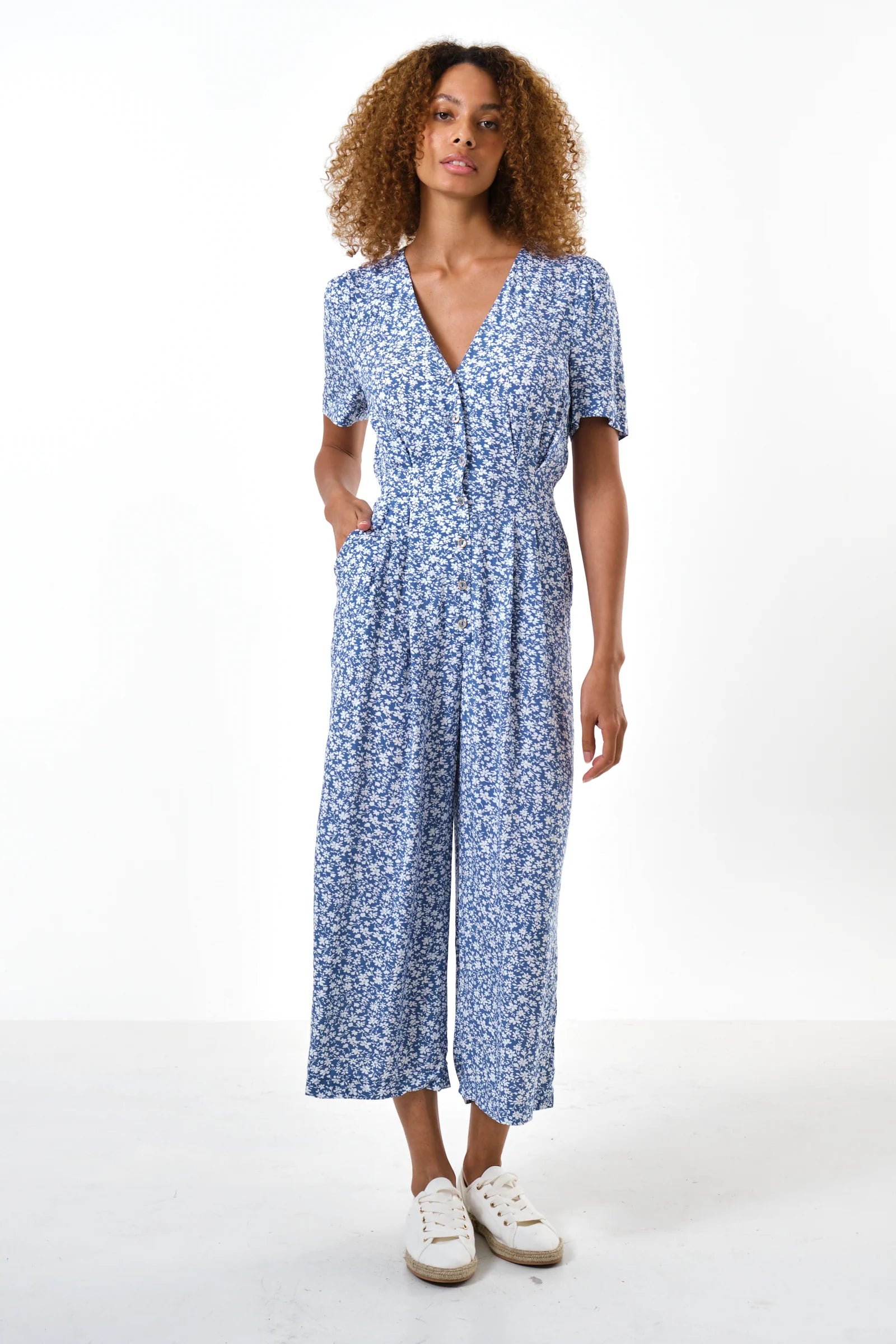 Belen Micro Blossom Print Short Sleeve Jumpsuit In Blue