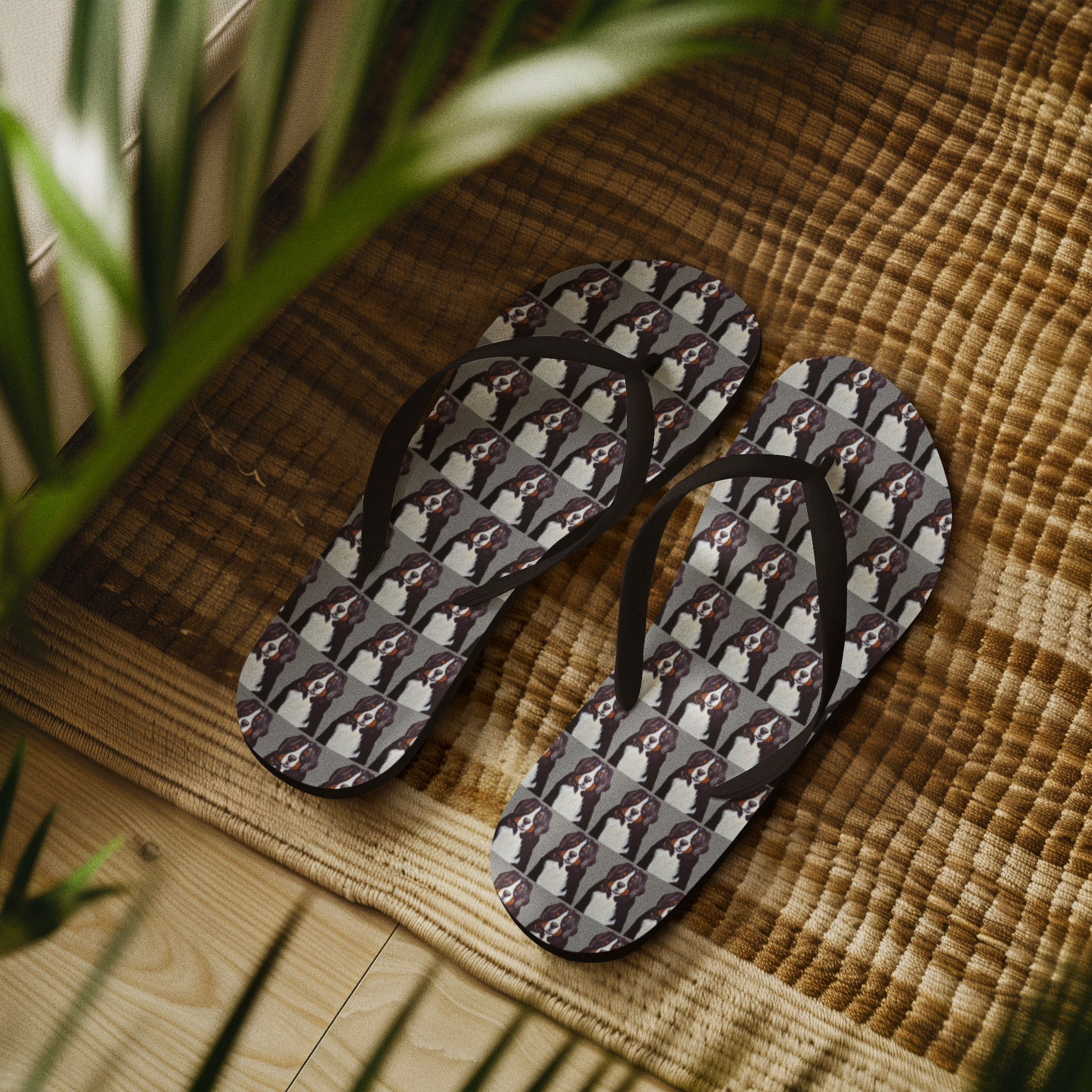 Step into ultimate Bernese comfort with these high-end flip flops featuring your favorite Giant Furry Therapist! Whether you're strolling along the beach or just padding around the house like a majestic mountain pup, these ultra-comfy, ethically made flip flops bring big dog energy to your every step. Because let’s face it—life’s better with a Berner underfoot!
