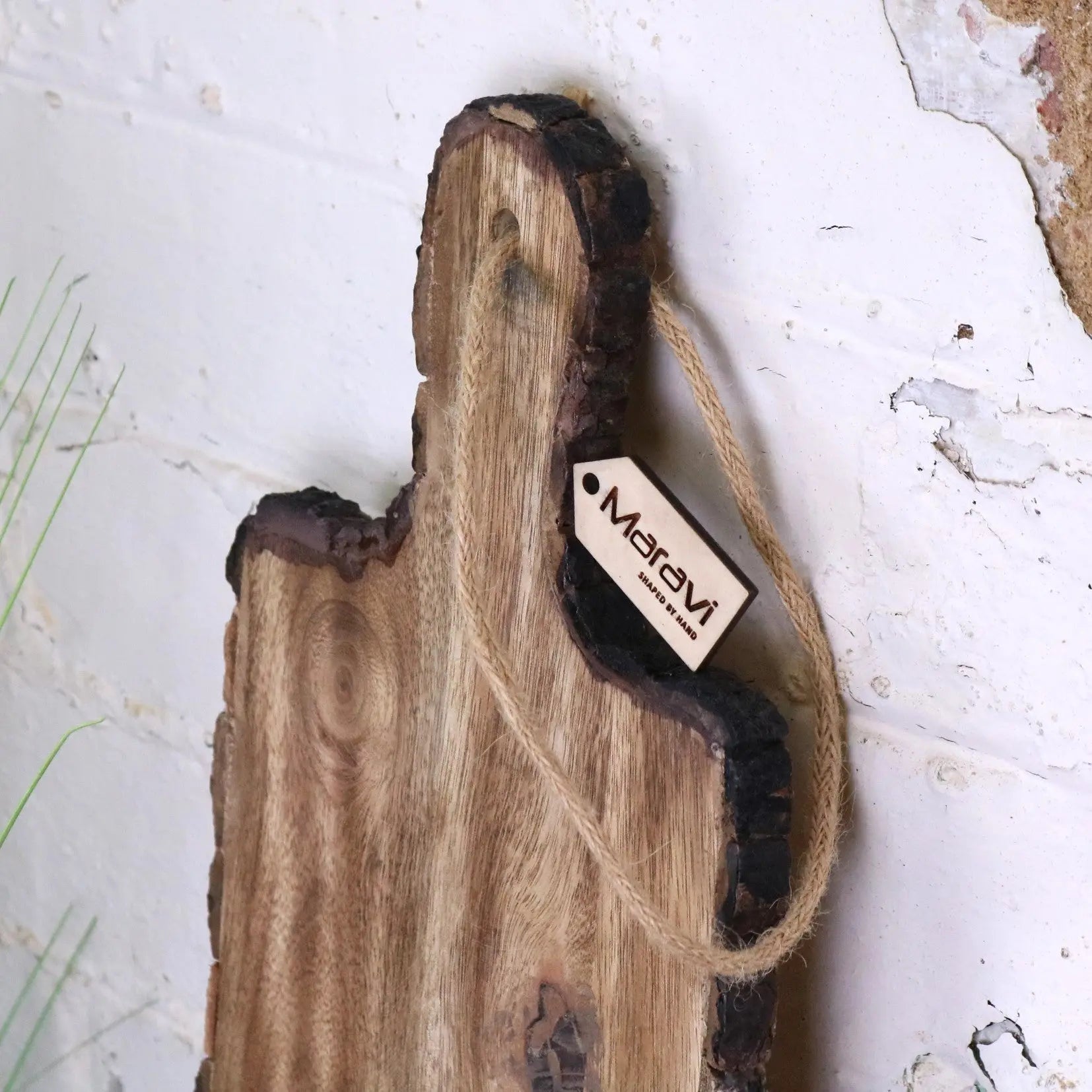 Each board is handcrafted from solid natural wood and features unique grain patterns with a live bark edge, ensuring that no two pieces are ever the same. The organic detailing adds to its rustic appeal, while the smooth surface provides the perfect base for serving cheeses, fruits, cured meats, or even indulgent desserts.