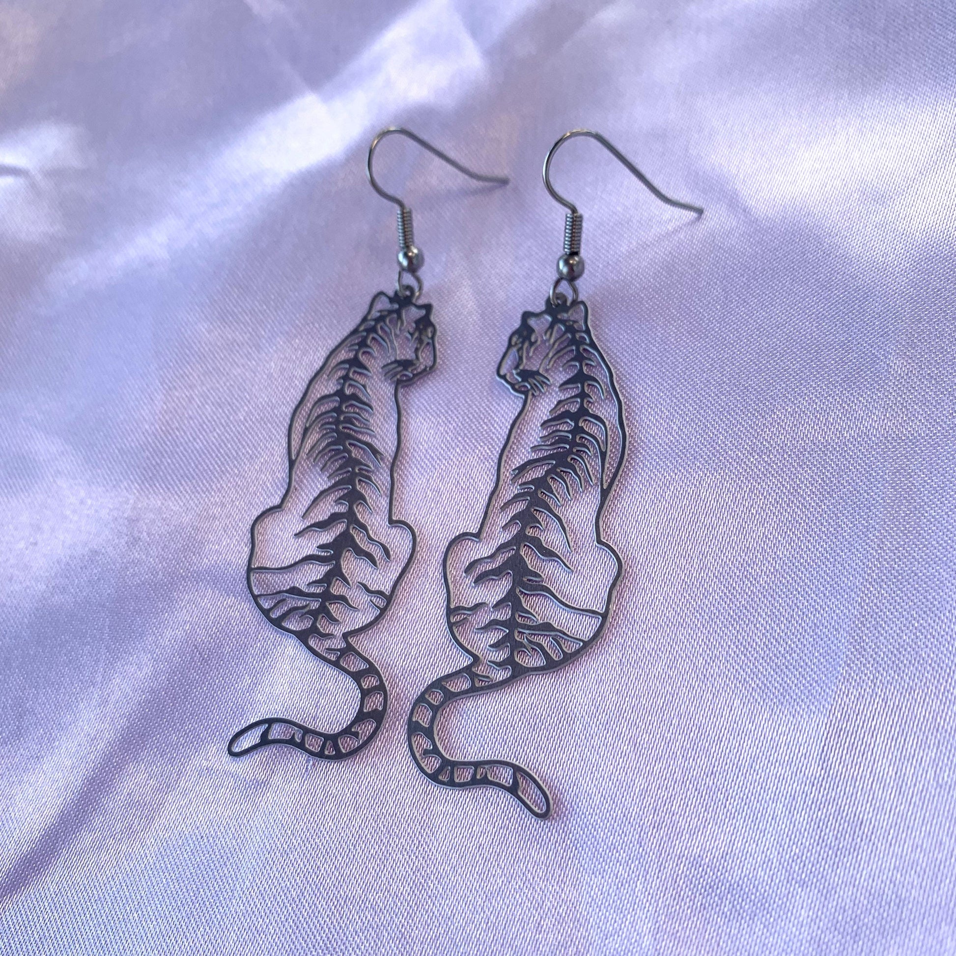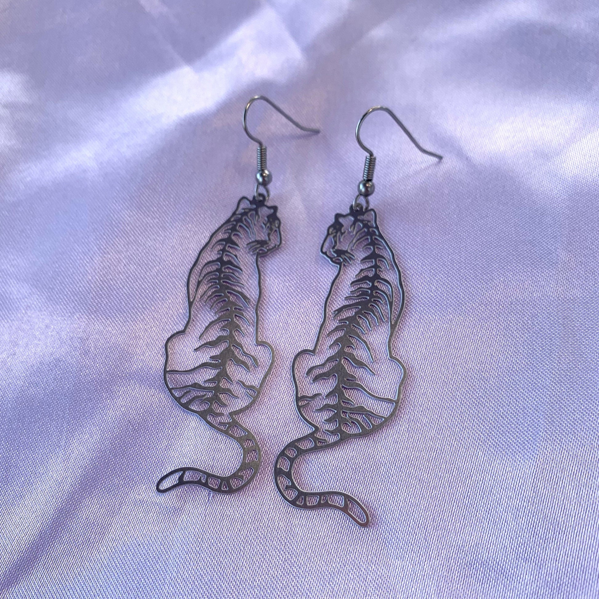 The tiger charms in these earrings are made from stainless steel and the hooks are made from surgical stainless steel.