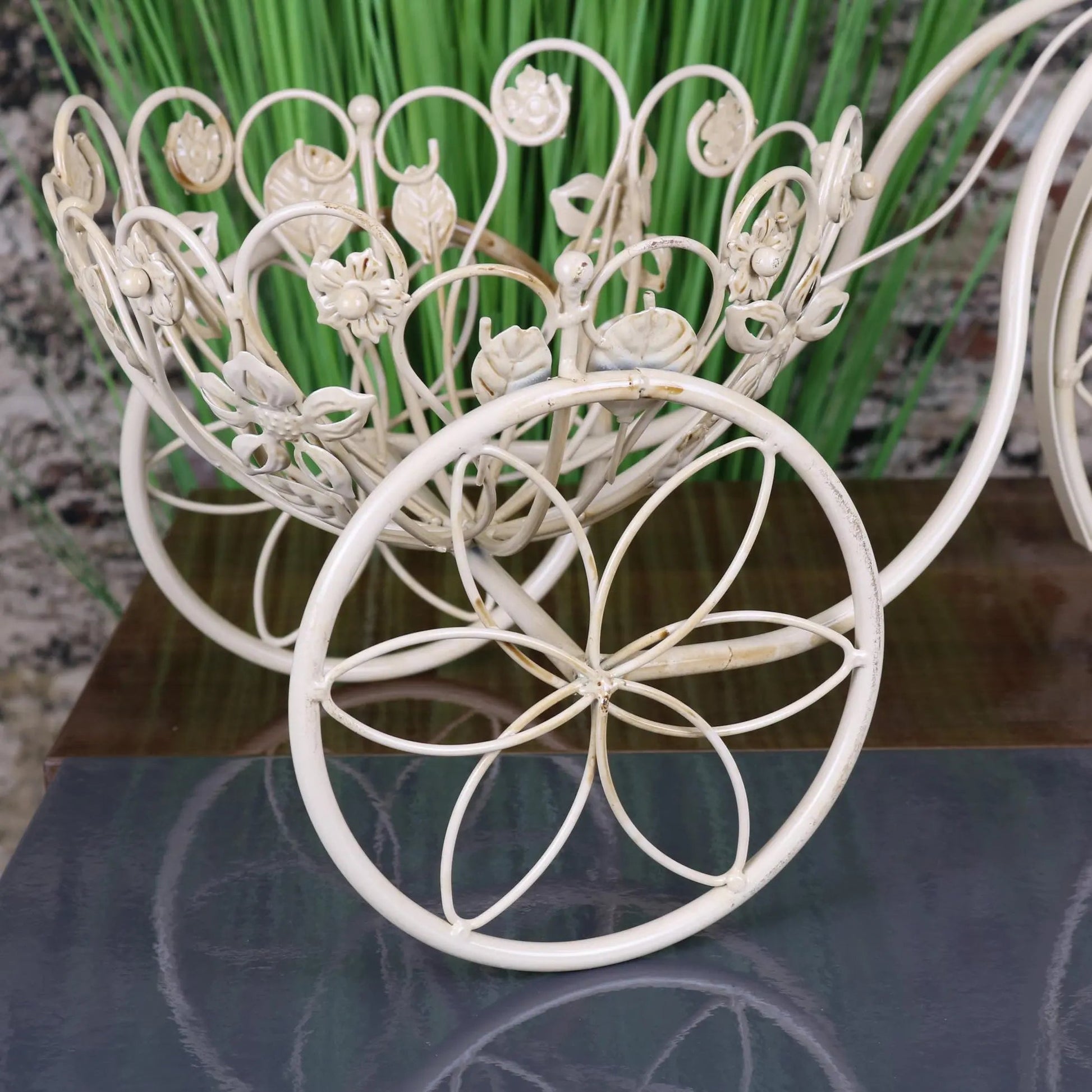 The bike planter is finished in vintage white paint, enhancing its rustic appeal and blending seamlessly with any decor style. Its sturdy construction ensures that it can support your plants while adding a delightful focal point to your gardening display.