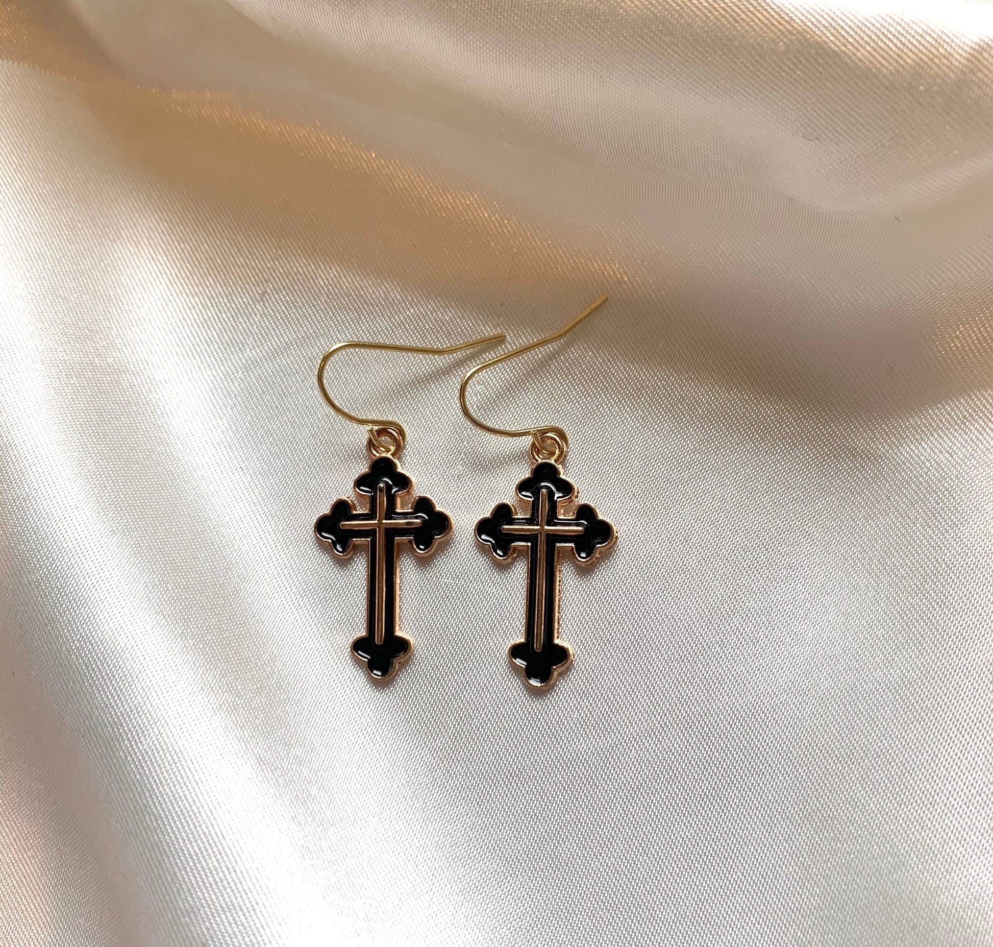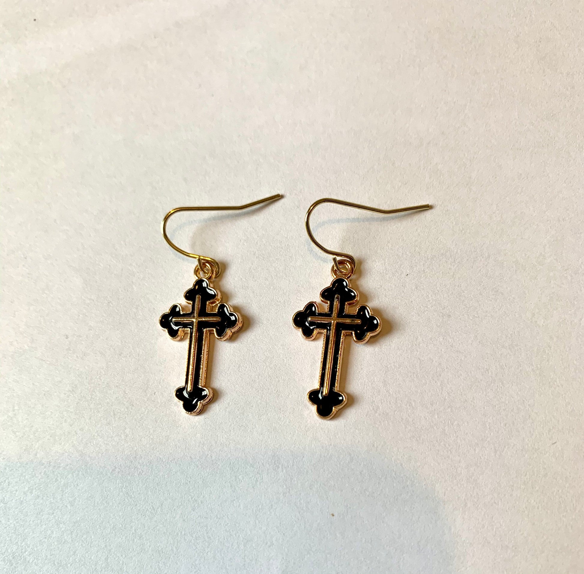 Ear hooks are made from 18k gold plated brass and crosses are made from enamel over zinc alloy (nickel, lead and cadmium free).