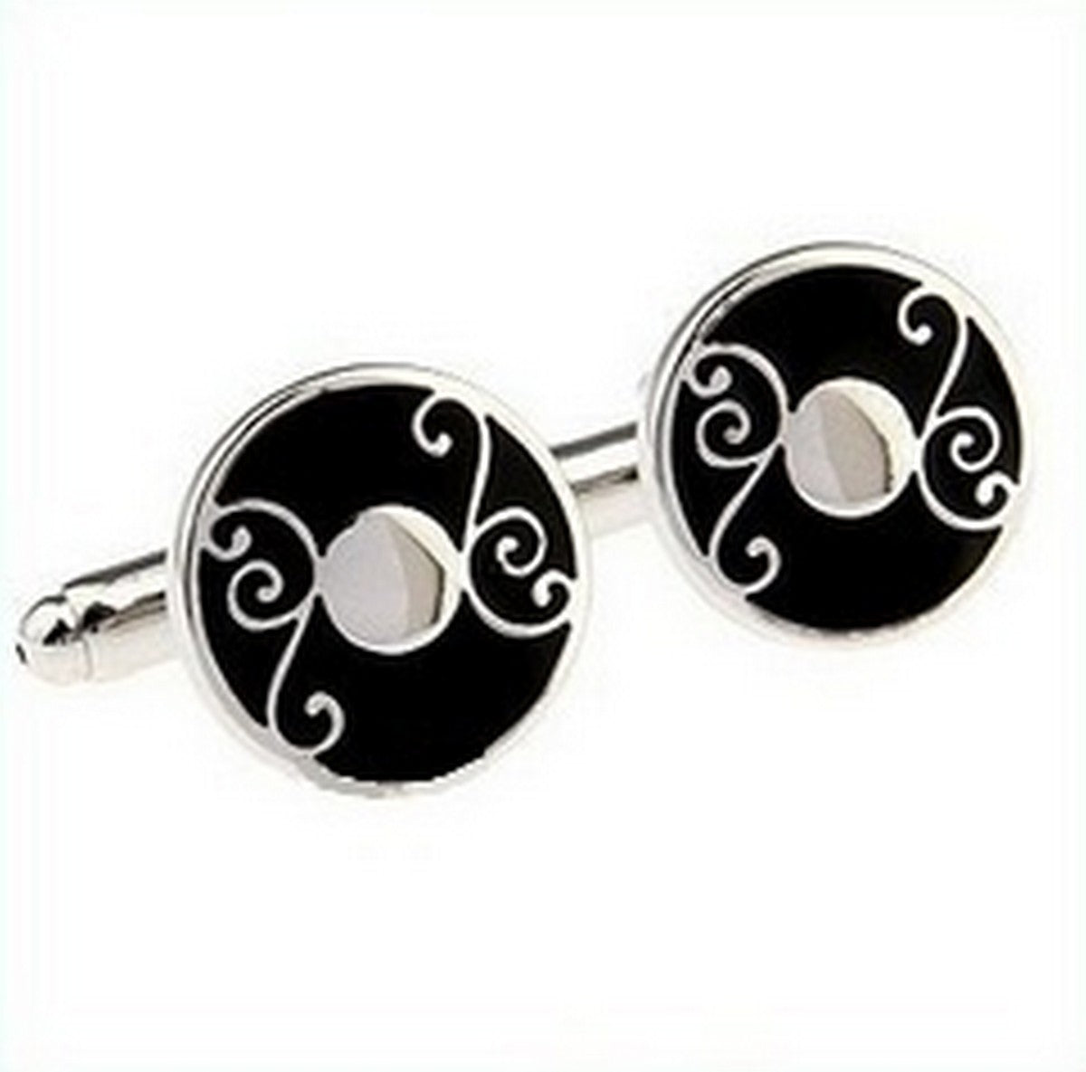 black and silver circular cufflinks