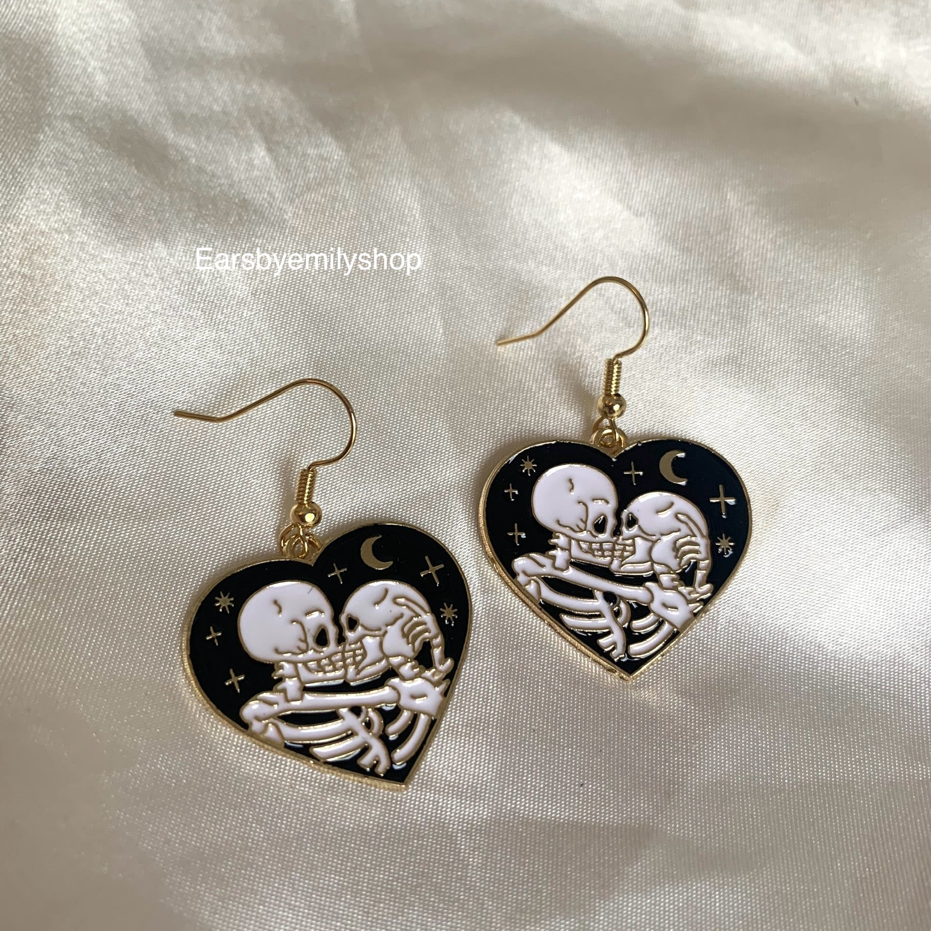 A cool pair of black kissing skeleton earrings in heart, on 18k gold plated hooks.