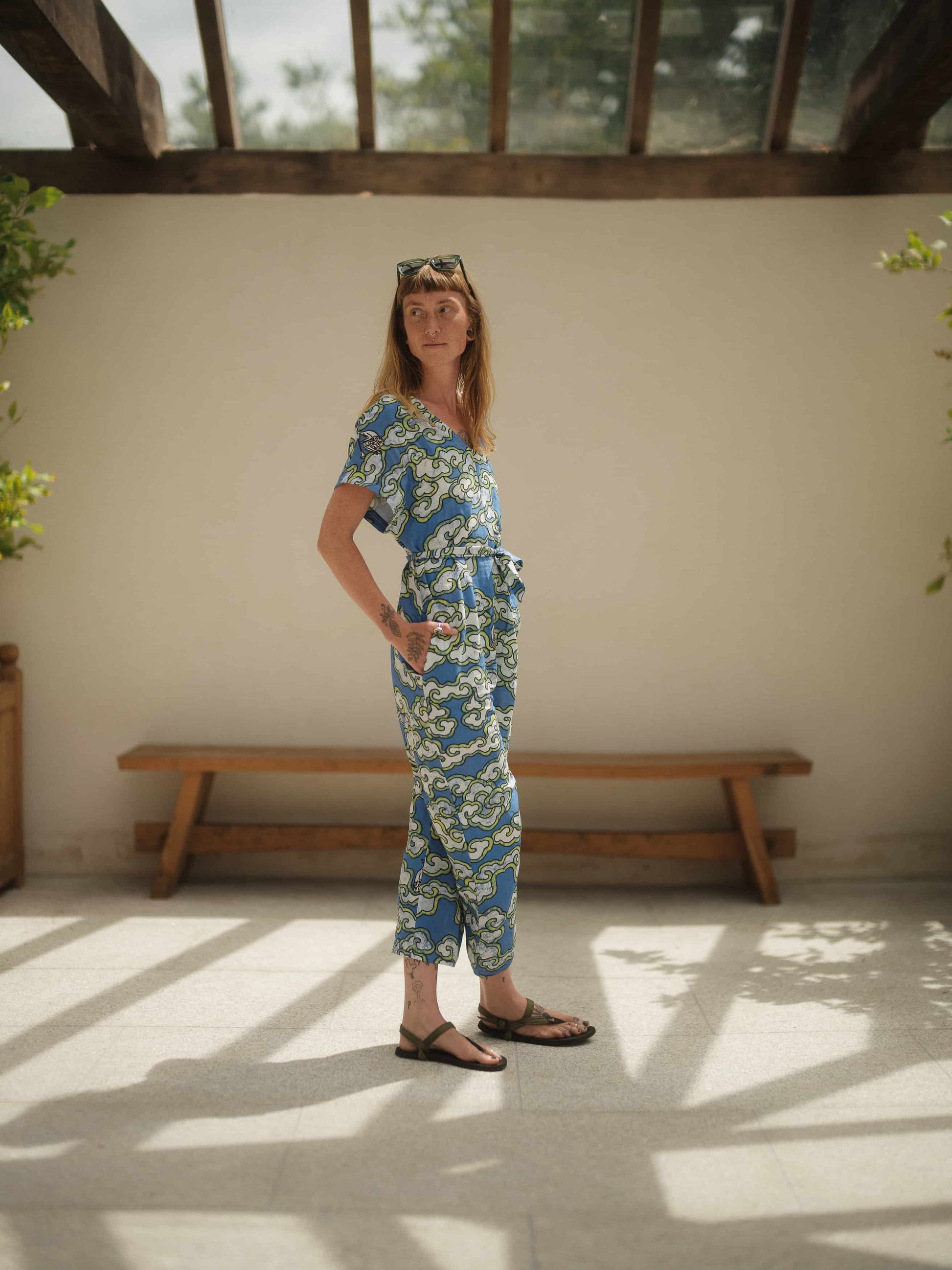 Embrace effortless style with this loose-fit jumpsuit featuring a tie waist for a flattering silhouette and pockets. Showcasing our beloved green clouds print transformed into hand-painted blue clouds with vibrant pops of luminous green, it’s a fresh twist on a classic. Crafted in the UK from a luxurious blend of linen and EcoVera, this jumpsuit feels as good as it looks. Perfect for those who love comfort, colour, and conscious fashion all in one.