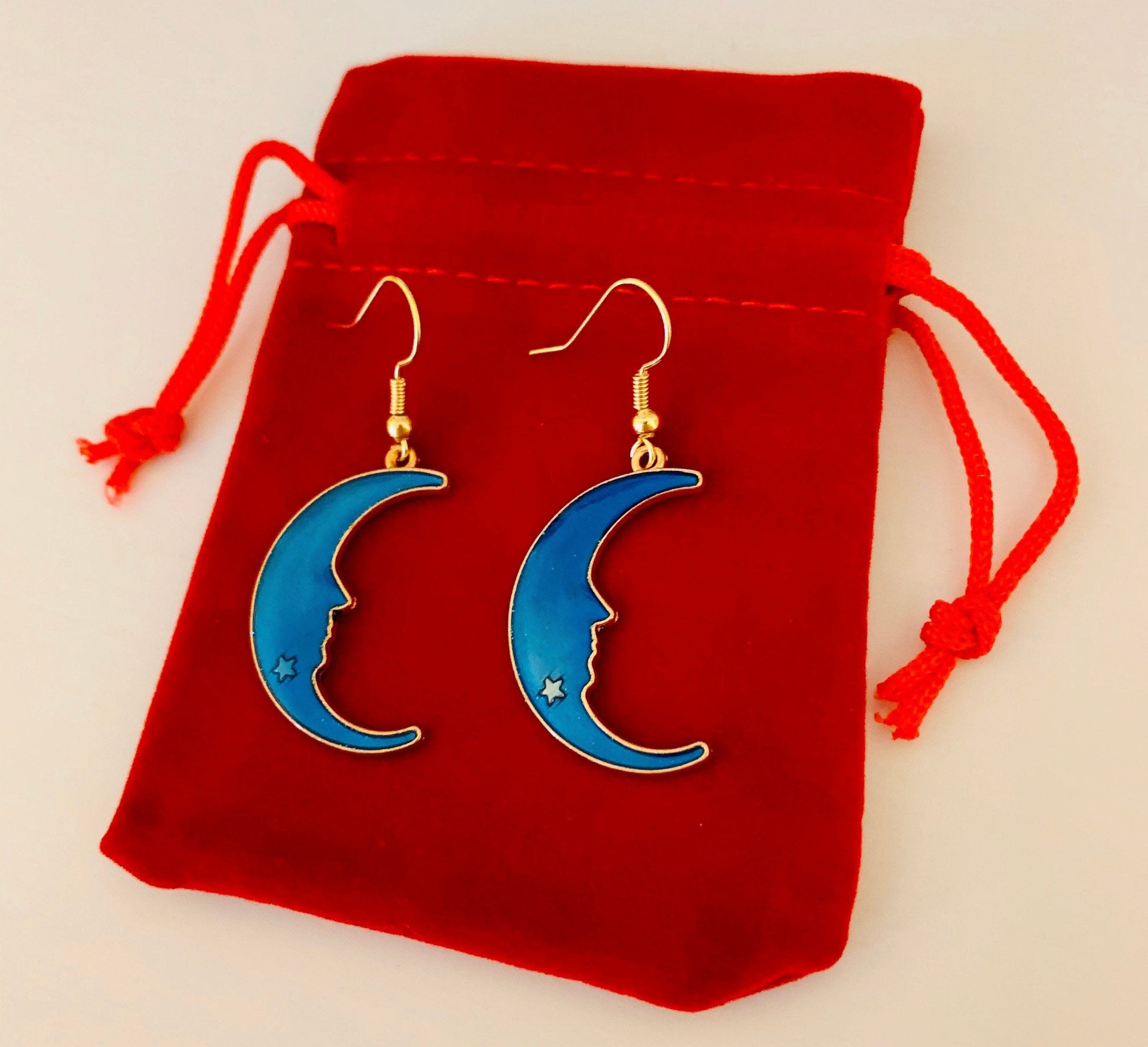 Gorgeous set of blue enamel star and moon gold drop/ dangle earring set.