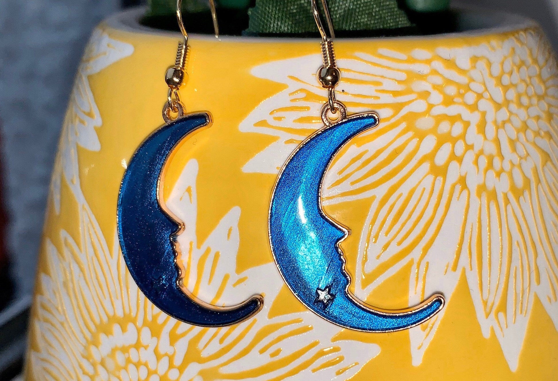 Blue enamel gold moon drop dangle earrings
