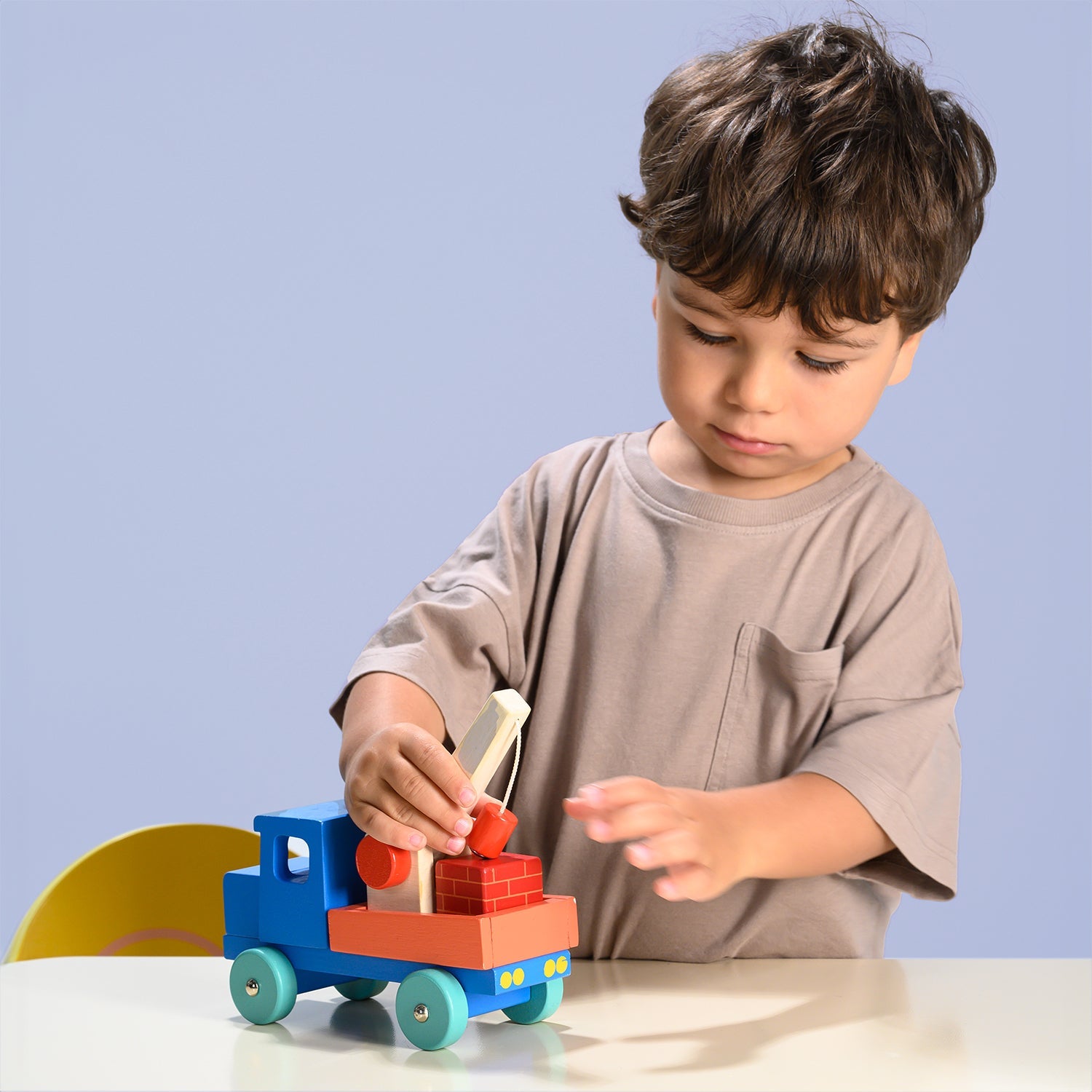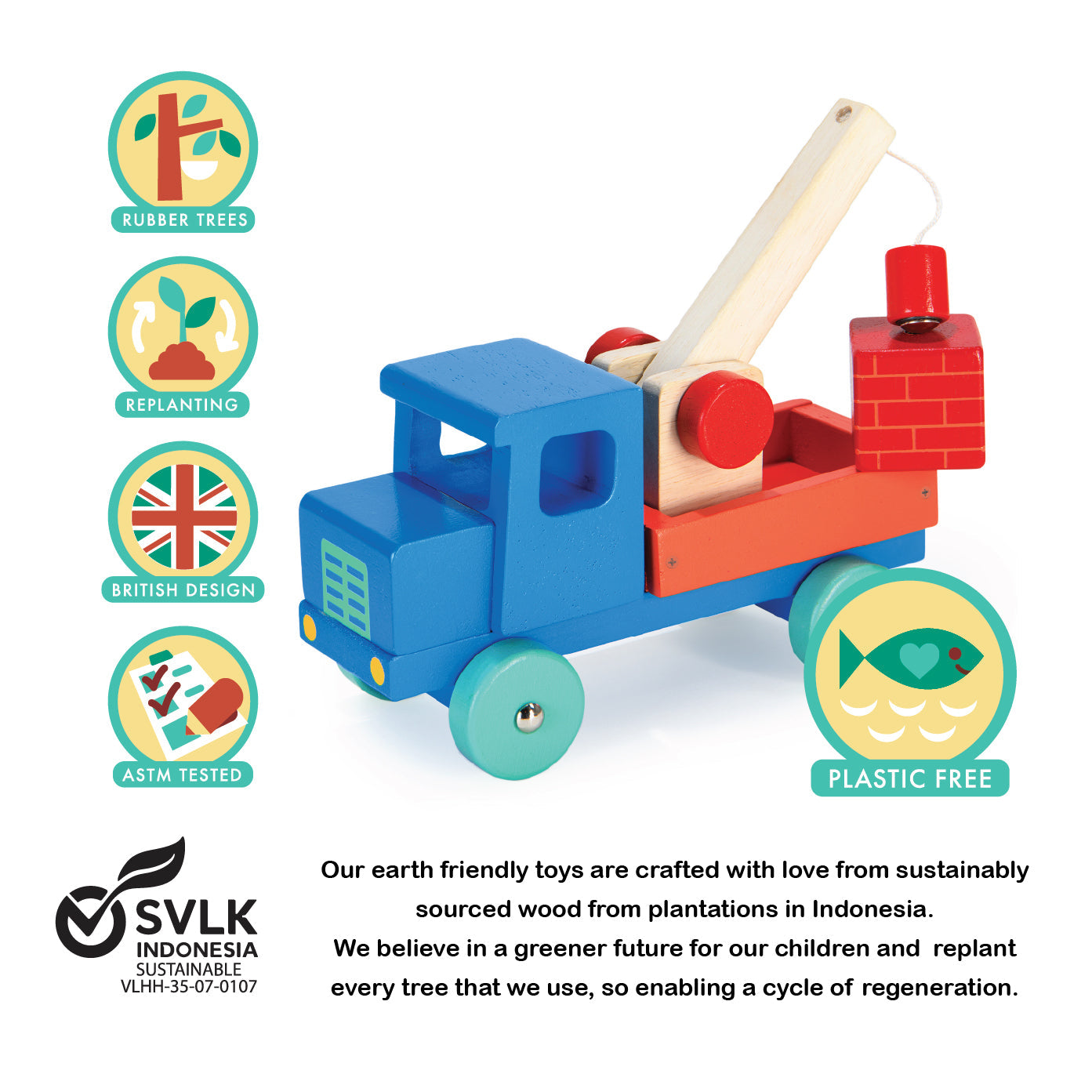 Based on a retro design, the simple clean lines give this traditional toy a refreshing look and feel. A classic blue pickup truck with magnetic block and wind-up loader.