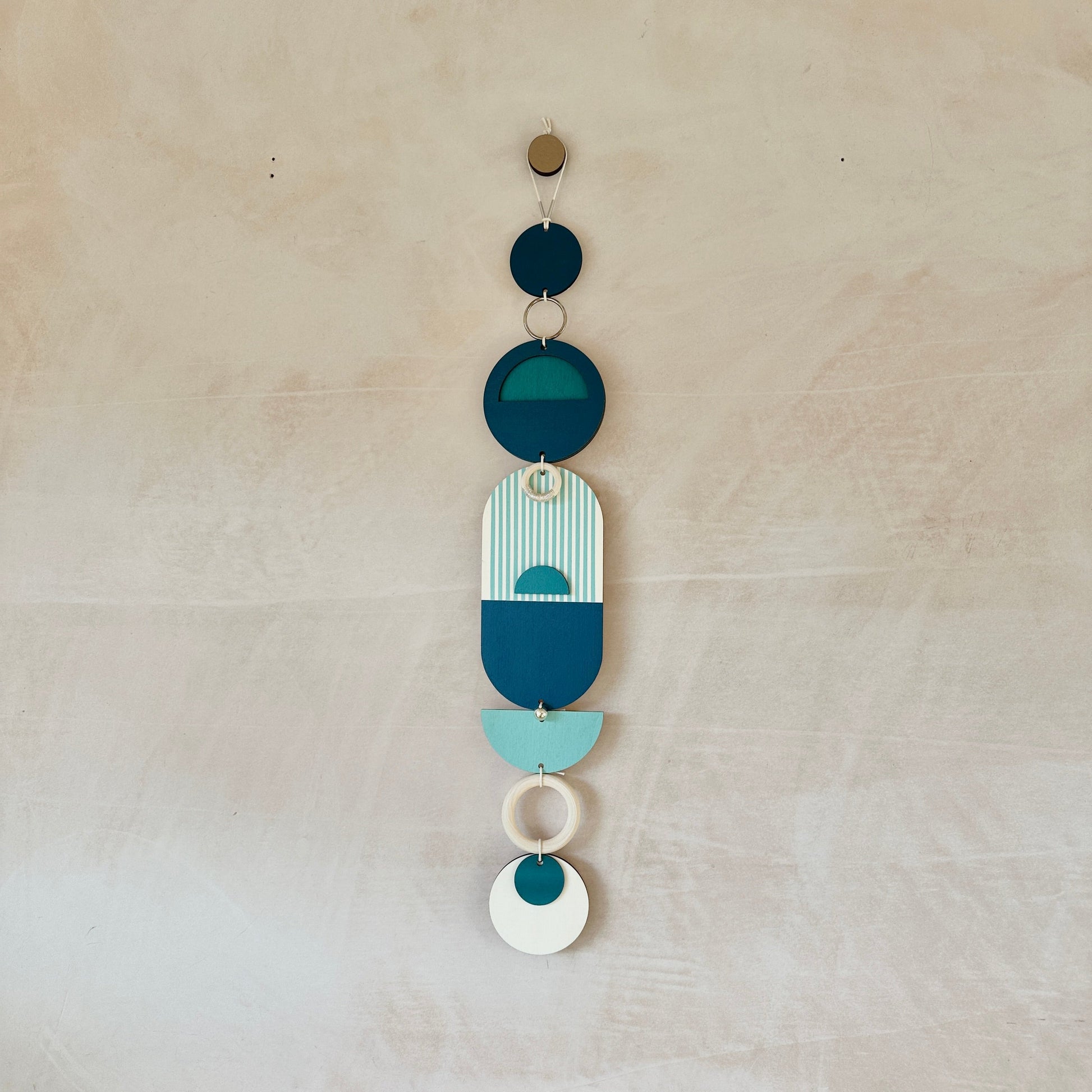 Lovingly handmade modern wall art. These pieces are made from plywood, paint, metal and waxed cord. The colours used are beautiful blues with silver components. These slim wall hangings would make a beautiful addition to any room to create a modern mid-century feel. Made from sustainable plywood, hand painted and constructed in Milton Keynes, England.